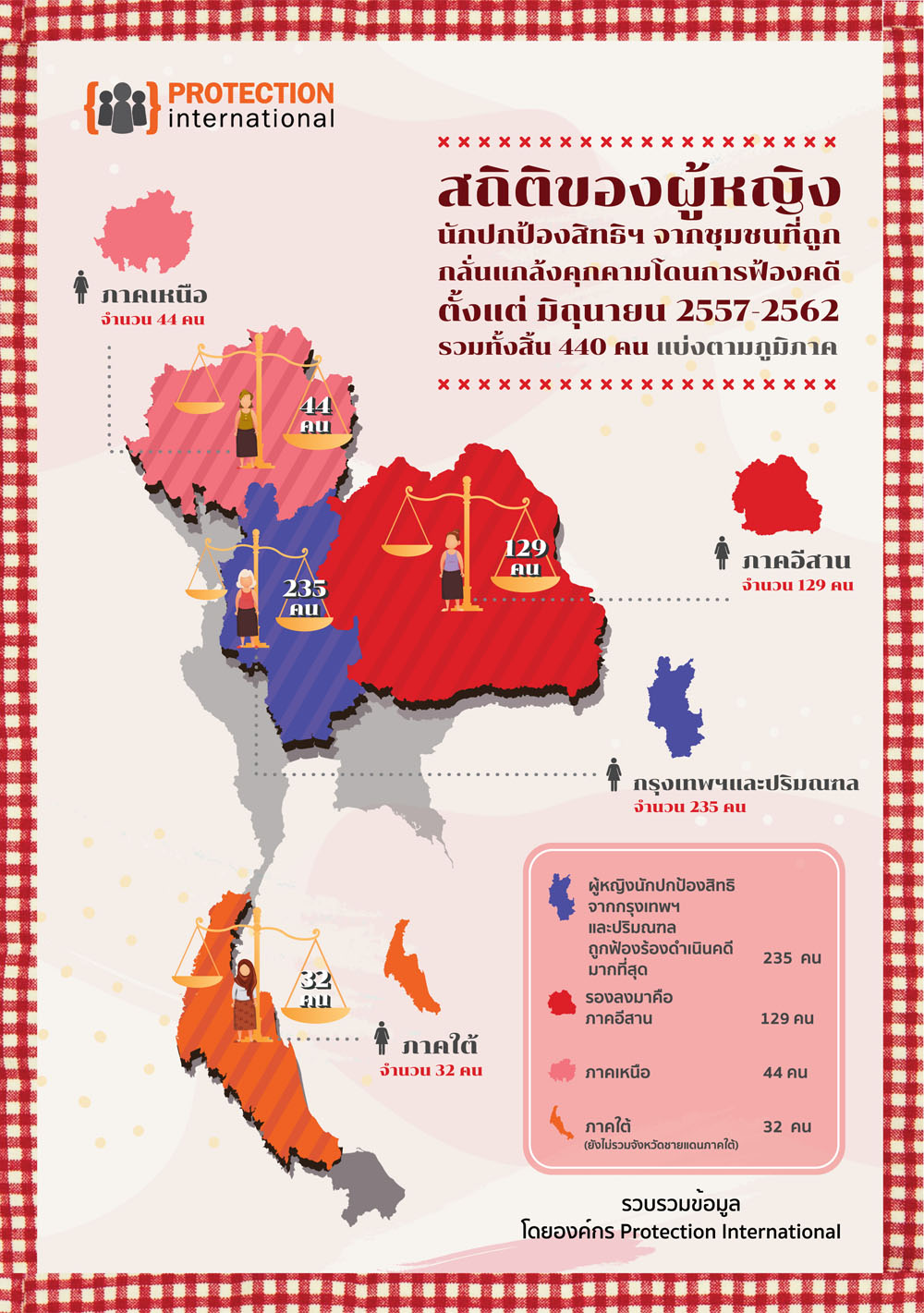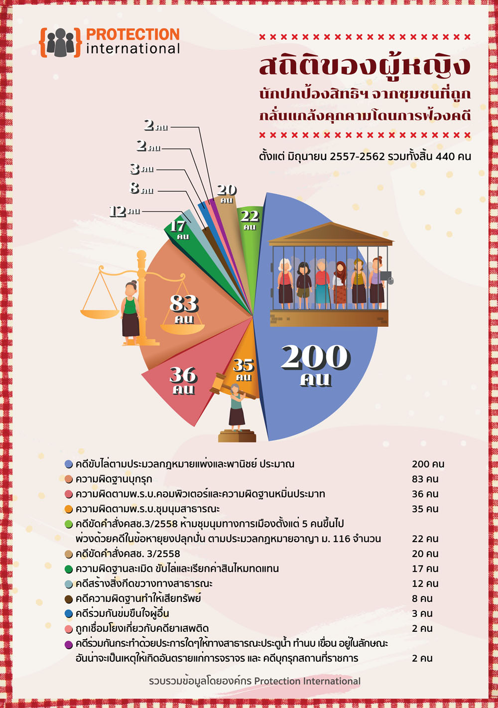“ระหว่างปี 2557-2562 มีผู้หญิงนักปกป้องสิทธิที่ถูกคุกคามด้วยการดำเนินคดีทางกฎหมายอย่างน้อย 440 คน แบ่งเป็น ความผิดฐานบุกรุก 83 คน ความผิดตามพ.ร.บ.คอมพิวเตอร์ ความผิดฐานหมิ่นประมาท จำนวน 36 คน ความผิดตามพ.ร.บ.ชุมนุมสาธารณะ 35 คน คดีขัดคำสั่งคสช.3/2558 ห้ามชุมนุมทางการเมืองตั้งแต่ 5 คนขึ้นไปพ่วงด้วยคดีในข้อหายุยงปลุกปั่น ตามประมวลกฏหมายอาญา ม. 116 จำนวน 22 คน คดีขัดคำสั่งคสช. 3/2558 จำนวน 20 คน การฟ้องร้องความผิดฐานละเมิด ขับไล่และเรียกค่าสินไหมทดแทน 17 คน คดีสร้างสิ่งกีดขวางทางสาธารณะ 12 คน คดีร่วมกันข่มขืนใจผู้อื่น 3 คน ถูกเชื่อมโยงเกี่ยวกับคดียาเสพติด 2 คน