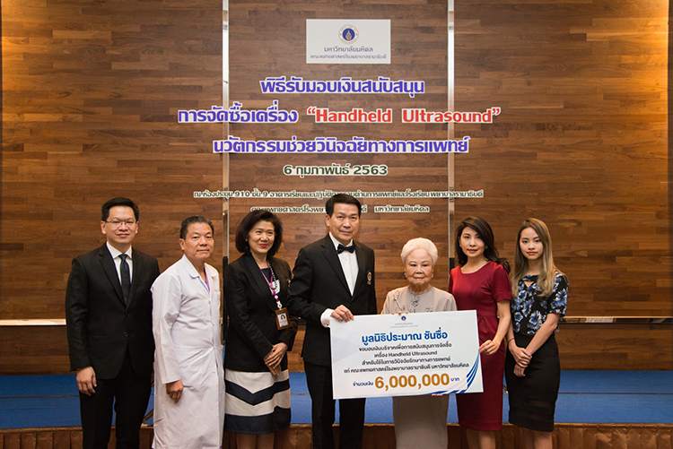 เมื่อวันที่ 6 ก.พ. 2563 เวลา 11.00 น. ณ ห้องประชุม 910B-C ชั้น 9 อาคารเรียนและปฏิบัติการรวมด้านการแพทย์และโรงเรียนพยาบาลรามาธิบดี คณะแพทยศาสตร์โรงพยาบาลรามาธิบดี มหาวิทยาลัยมหิดล ได้จัดพิธีรับมอบเงินสนับสนุนการจัดซื้อเครื่อง “Handheld Ultrasound” นวัตกรรมช่วยวินิจฉัยทางการแพทย์ ขึ้น
