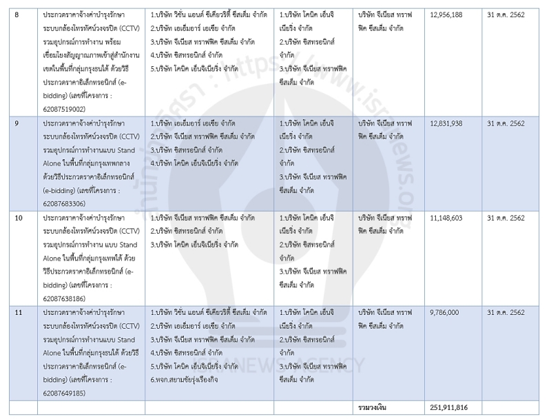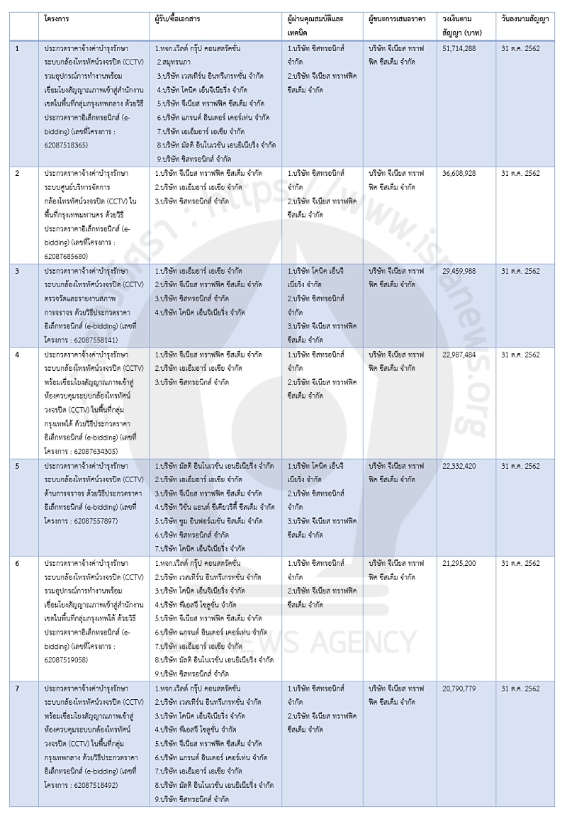 พบว่า มีเอกชนเข้าร่วมซื้อซองเอกสารร่วมประมูลตามโครงการต่าง ๆ จำนวน 14 ราย คือ 1.หจก.เวิลด์ กรุ๊ป คอนสตรัคชั่น 2.สมุทรนภา 3.บริษัท เวสเทิร์น อินทรีเกรทชั่น จำกัด 4.บริษัท โคนิค เอ็นจิเนียริ่ง จำกัด 5.บริษัท จีเนียส ทราฟฟิค ซีสเต็ม จำกัด 6.บริษัท แกรนด์ อินเตอร์ เคอร์เท่น จำกัด 7.บริษัท เอเอ็มอาร์ เอเซีย จำกัด 8.บริษัท มัลติ อินโนเวชั่น เอนยิเนียริ่ง จำกัด 9.บริษัท ซิสทรอนิกส์ จำกัด10.บริษัท วิชั่น แอนด์ ซีเคียวริตี้ ซีสเต็ม จำกัด 11.บริษัท ซูม อินฟอร์เมชั่น ซิสเต็ม จำกัด 12.หจก.เวิลด์ กรุ๊ป คอนสตรัคชั่น 13.บริษัท พีเอสจี โซลูชั่น จำกัด และ 14.หจก.สยามชัยรุ่งเรืองกิจ