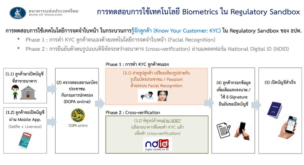 สำหรับแพลตฟอร์ม NDID เป็นโครงสร้างพื้นฐานเชื่อมต่อระหว่างหน่วยงานที่เป็นสมาชิกในการพิสูจน์และยืนยันตัวตนของลูกค้าระหว่างกัน โดยจะมีการนำเทคโนโลยีการจดจำใบหน้า (Facial Recogniton) มาใช้ในการพิสูจน์ยืนยันตัวตน เพื่อช่วยป้องกันความผิดพลาด หรือการปลอมแปลงตัวมาทำธุรกรรมการเงิน จากเดิมที่พนักงานใช้ตาเปรียบเทียบหน้าลูกค้าจากบัตรรประชาชน ซึ่งอาจทำให้เกิดความผิดพลาดจากการปฏิบัติงานได้