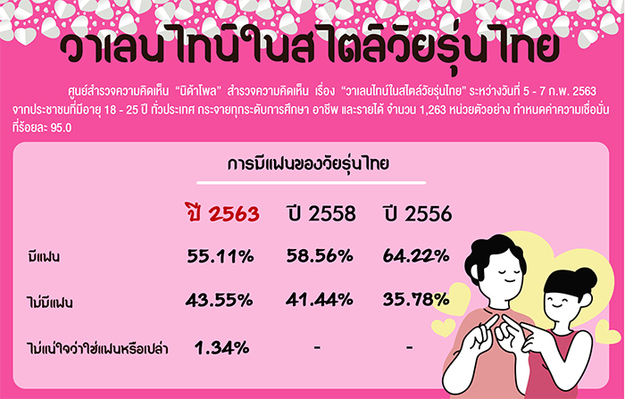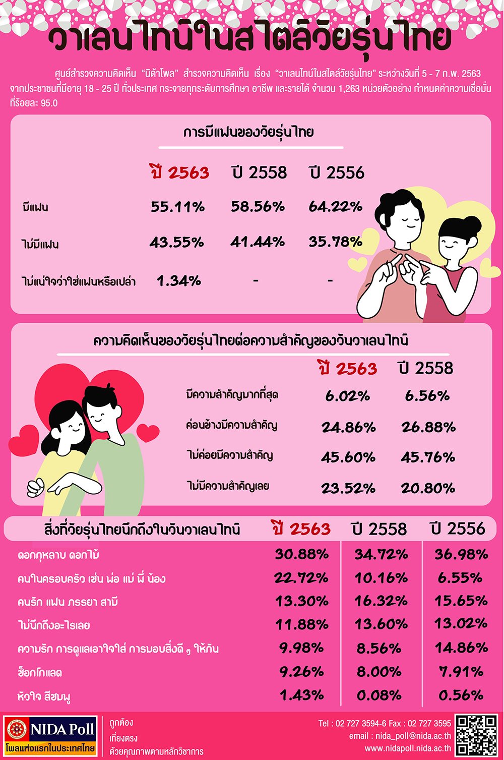 ศูนย์สำรวจความคิดเห็น “นิด้าโพล” สถาบันบัณฑิตพัฒนบริหารศาสตร์ (นิด้า) เปิดเผยผลสำรวจของประชาชน เรื่อง “วาเลนไทน์ในสไตล์วัยรุ่นไทย” ทำการสำรวจระหว่างวันที่ 5 – 7 ก.พ. 2563 จากประชาชนที่มีอายุ 18 - 25 ปี กระจายทุกภูมิภาค ระดับการศึกษา และอาชีพ ทั่วประเทศ รวมทั้งสิ้น จำนวน 1,263 หน่วยตัวอย่าง เกี่ยวกับความคิดเห็นที่มีต่อวันวาเลนไทน์ ซึ่งตรงกับวันที่ 14 ก.พ. ของทุกปี การสำรวจอาศัยการสุ่มตัวอย่างโดยใช้ความน่าจะเป็นจากบัญชีรายชื่อฐานข้อมูลตัวอย่างหลัก (Master Sample) ของ “นิด้าโพล” สุ่มตัวอย่างด้วยวิธีแบบง่าย (Simple Random Sampling) เก็บข้อมูลด้วยวิธีการสัมภาษณ์ทางโทรศัพท์โดยกำหนดค่าความเชื่อมั่นที่ร้อยละ 95.0