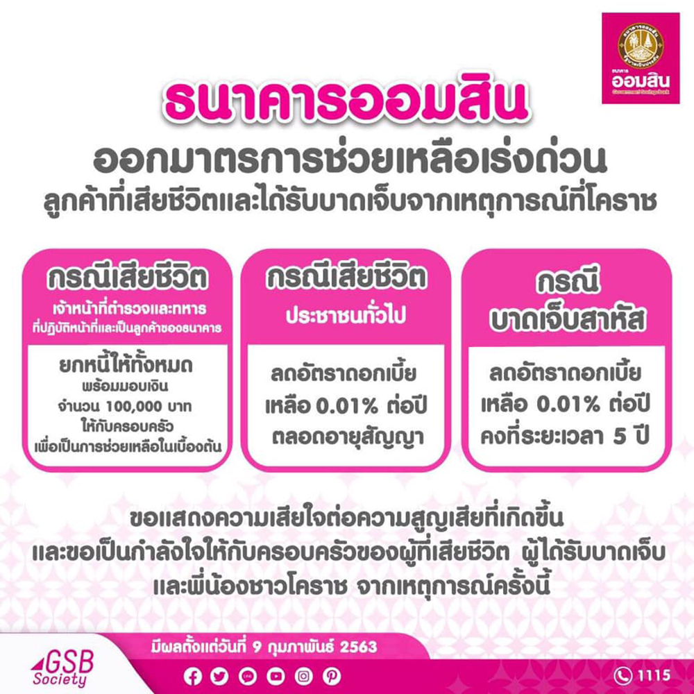ด้านนายชาติชาย พยุหนาวีชัย ผู้อำนวยการธนาคารออมสิน กล่าวว่า จากเหตุการณ์ความรุนแรงในพื้นที่จังหวัดนครราชสีมา ซึ่งส่งผลให้มีผู้เสียชีวิตและบาดเจ็บจำนวนมาก ธนาคารออมสิน ในฐานะสถาบันการเงินของรัฐ จึงมีมาตรการบรรเทาความเดือดร้อนให้กับลูกค้าและไม่ใช่ลูกค้าของธนาคารเป็นกรณีเร่งด่วน ดังนี้