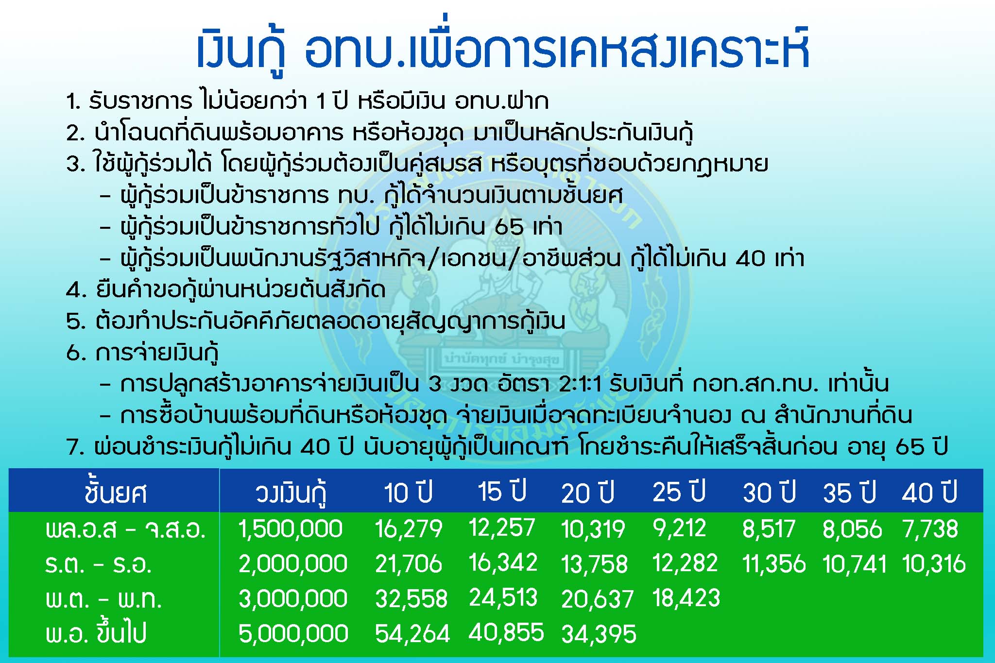 รวมไปถึงข้อกำหนดการจ่ายเงินกู้ อยู่ตรงที่การปลูกสร้างอาคารจ่ายเงินเป็น 3 งวด อัตรา 2:1:1 รับเงินที่ กอท.สก.ทบ.เท่านั้น?