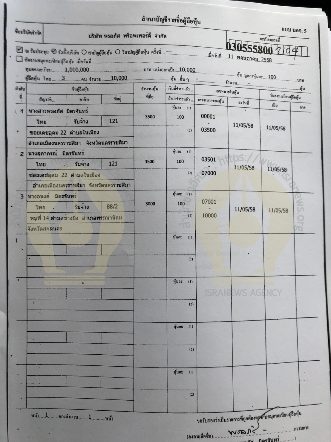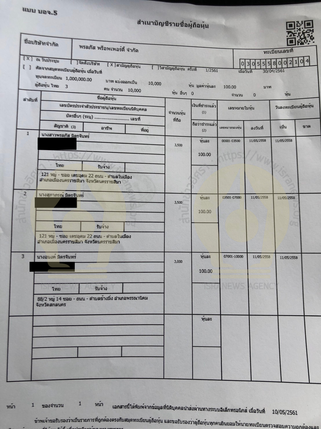 สำหรับสำเนาบัญชีรายชื่อผู้ถือหุ้น (บอจ.5) ที่แจ้งต่อกรมพัฒนาธุรกิจการค้า ครั้งสุดท้าย ลงวันที่ 30 เม.ย. 2561 ยังมีผู้ถือหุ้น 3 รายเช่นเดิม โดย น.ส.พรลภัส ถือ 3,500 หุ้น นางสุภาภรณ์ ถือ 3,500 หุ้น นางอนงค์ 3,000 หุ้น