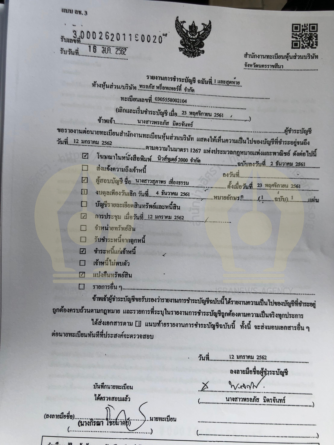 หลังจากนั้นเมื่อวันที่ 16 ม.ค. 2562 น.ส.พรลภัส ทำหนังสือถึงนายทะเบียน แจ้งเลิกและเริ่มการชำระบัญชีบริษัทตามผลการประชุมผู้ถือหุ้นทั้ง 3 ราย เมื่อวันที่ 12 ม.ค. 2562 โดยมีผลตั้งแต่วันที่ 23 พ.ย. 2561 โดยในรายละเอียดมีการชำระหนี้แก่เจ้าหนี้ และแบ่งคืนทรัพย์สิน