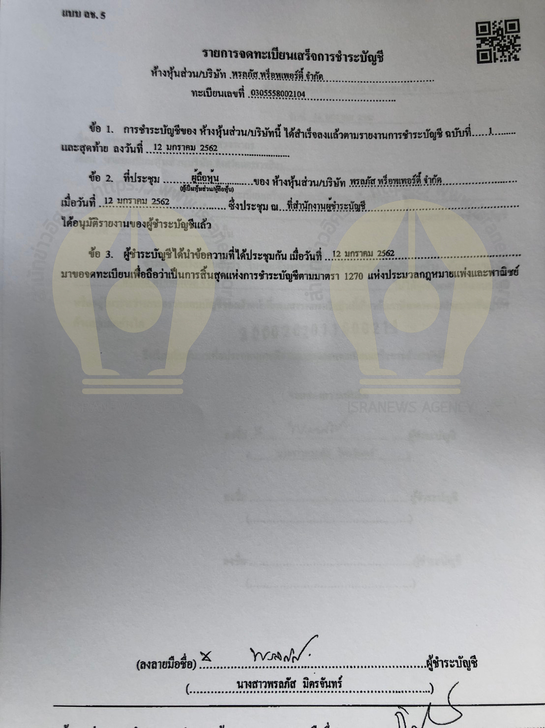 “…หลังจากนั้นเมื่อวันที่ 16 ม.ค. 2562 น.ส.พรลภัส ทำหนังสือถึงนายทะเบียน แจ้งเลิกและเริ่มการชำระบัญชีบริษัทตามผลการประชุมผู้ถือหุ้นทั้ง 3 ราย เมื่อวันที่ 12 ม.ค. 2562 โดยมีผลตั้งแต่วันที่ 23 พ.ย. 2561 โดยในรายละเอียดมีการชำระหนี้แก่เจ้าหนี้ และแบ่งคืนทรัพย์สิน รายงานของผู้สอบบัญชีตั้งแต่ปี 2558 (จัดตั้งบริษัท) จนถึงปลายปี 2561 (จดทะเบียนเลิกบริษัท) ระบุว่า บริษัทแห่งนี้มิได้ประกอบกิจการในรอบระยะเวลาบัญชีนี้แต่อย่างใด ?...”