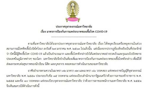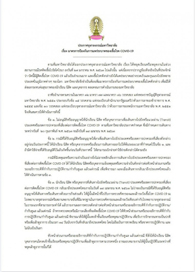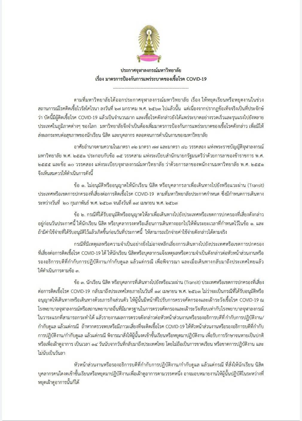 สำนักข่าวอิศรา (www.isranews.org) รายงานว่า เมื่อวันที่ 19 ก.พ.2563 จุฬาลงการณ์มหาวิทยาลัย ได้ออกประกาศเรื่องมาตรการป้องกันการแพร่ระบาดของเชื้อโรค COVID-19 โดยอาศัยอำนาจตามพระราชบัญญัติจุฬาลงกรณ์มหาวิทยาลัย พ.ศ.2551 ไม่อนุมัติหรืออนุญาตให้นักเรียน นิสิต หรือบุคลากรลาเพื่อเดินทางไปหรือแวะผ่านประเทศหรือเขตการปกครองที่เสี่ยงต่อการติดเชื้อโรค 9 แห่ง ได้แก่ เกาหลีใต้ จีน ไต้หวัน ฮ่องกง มาเก๊า ญี่ปุ่น มาเลเซีย เวียดนาม สิงคโปร์ ระหว่างวันที่ 20 ก.พ.2563- 19 เม.ย.2563