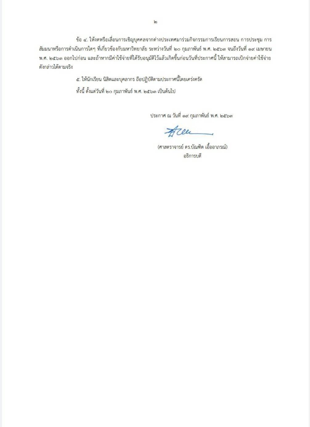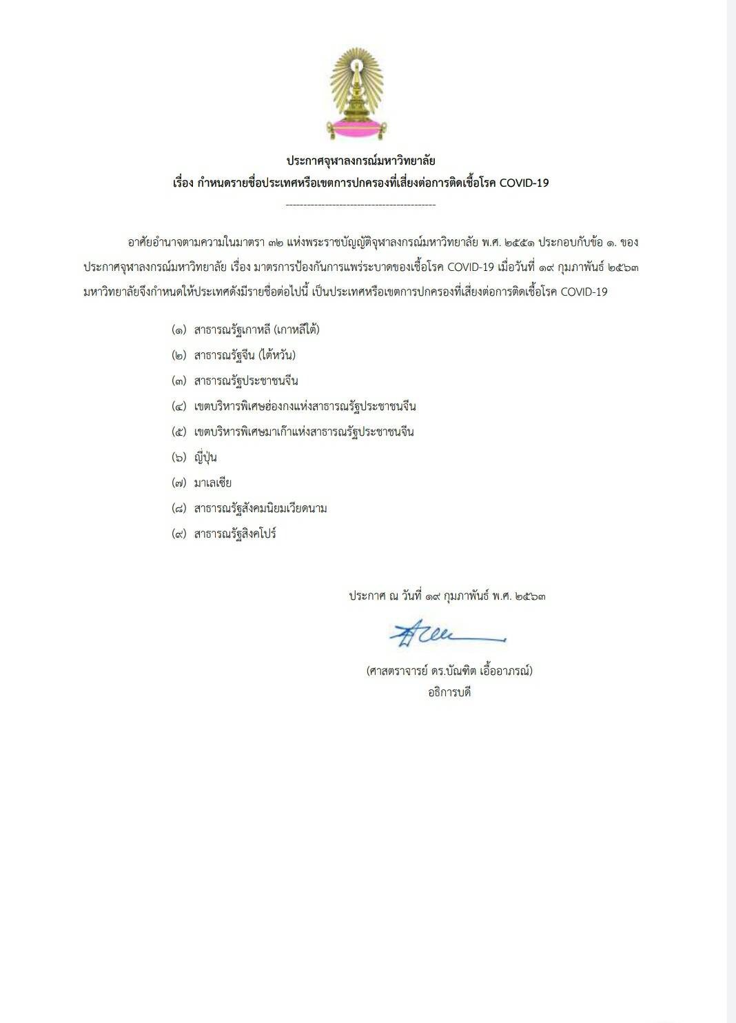 ทั้งนี้ ในประกาศดังกล่าว ยังระบุให้งดหรือเลื่อนเชิญบุคคลจากต่างประเทศมาร่วมกิจกรรมการเรียนการสอน การประชุม สัมมนา หรือดำเนินการใดๆ ที่เกี่ยวข้องกับมหาวิทยาลัย ระหว่างวันที่ 20 ก.พ.2563- 19 เม.ย.2563 ด้วย (ดูรายละเอียดประกาศ)