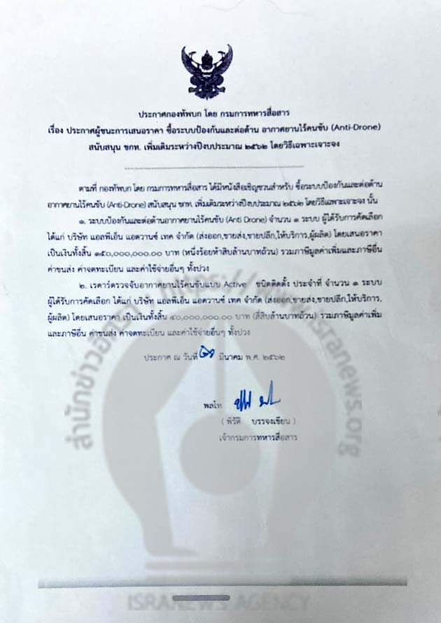 ล่าสุด สำนักข่าวอิศรา ตรวจสอบพบว่า บริษัทเอกชน ที่ชนะการเสนอราคาโครงการจัดซื้อระบบป้องกันและต่อต้านอากาศยานไร้คนขับ (Anti-Drone) ทั้งในส่วนระบบป้องกันและต่อต้านอากาศยานไร้คนขับ (Anti Drone) วงเงิน 150 ล้านบาท และ เรดาร์ตรวจจับอากาศยานไร้คนขับแบบ Active ชนิดติดตั้ง ประจำที่ วงเงิน 40 ล้านบาท รวมวงเงิน 2 รายการ 190 ล้านบาท ก็คือ บริษัท แอลพีเอ็น แอดวานซ์ เทค จำกัด (ดูประกาศประกอบ)