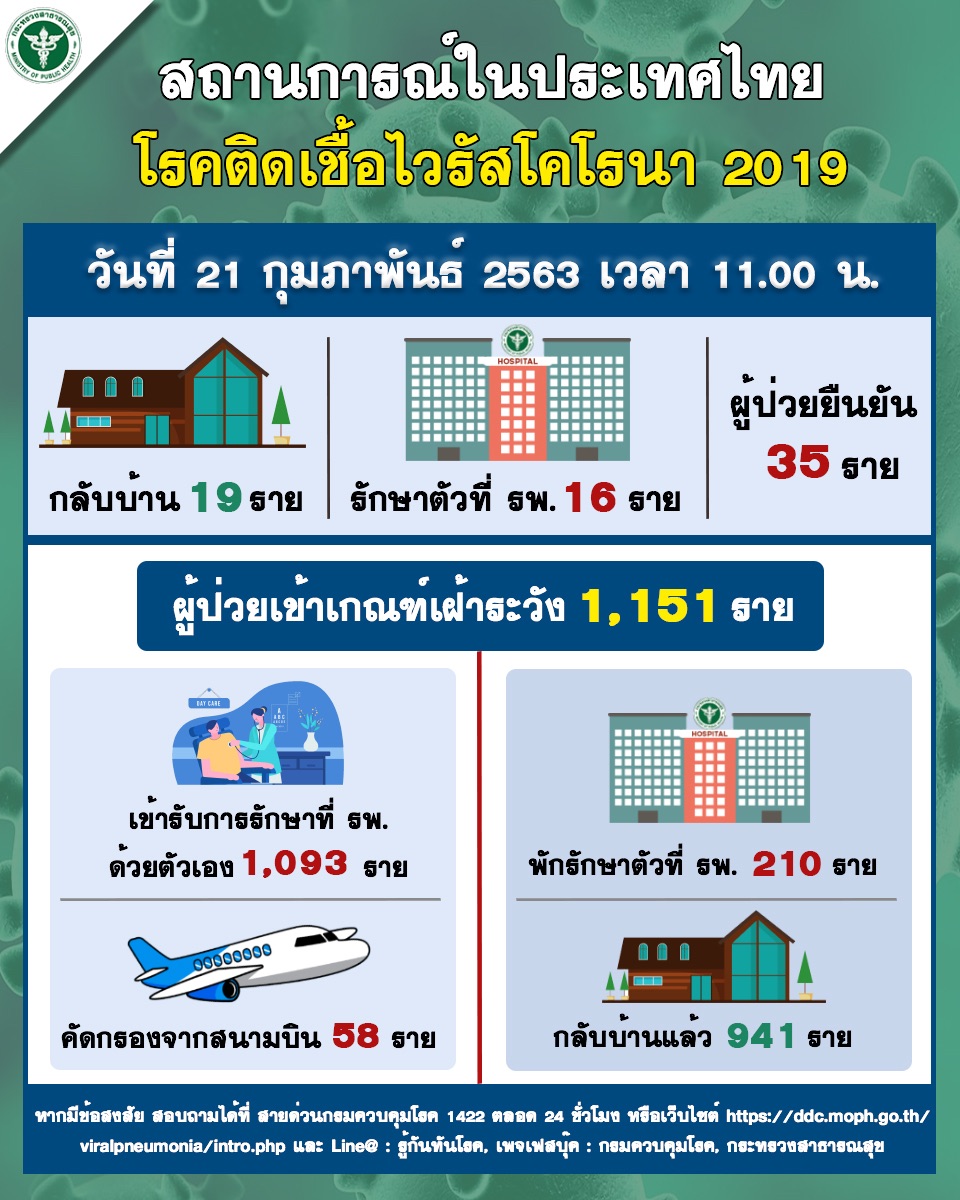 1. ผู้ป่วยยืนยันติดเชื้อรักษาในโรงพยาบาล 16 ราย กลับบ้านแล้ว 19 ราย รวมสะสม 35 ราย