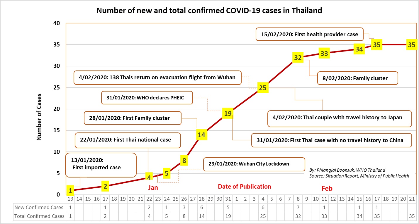 ทั้งนี้องค์การอนามัยโลกประจำประเทศไทย แสดงกราฟเพื่อให้เห็นผู้ติดเชื้อไวรัสโควิด-19 ทั้ง 35 ราย อย่างละเอียด ตั้งแต่ผู้ป่วยคนแรกที่เจอในประเทศไทยเดินมาเข้ามาจากต่างประเทศวันที่ 13 มกราคม 2563 ผู้ป่วยติดเชื้อที่เป็นคนไทย กระทั่งคนล่าสุด วันที่ 15 กุมภาพันธ์ 2563 เป็นบุคลากรทางการแพทย์ (First health provider case)