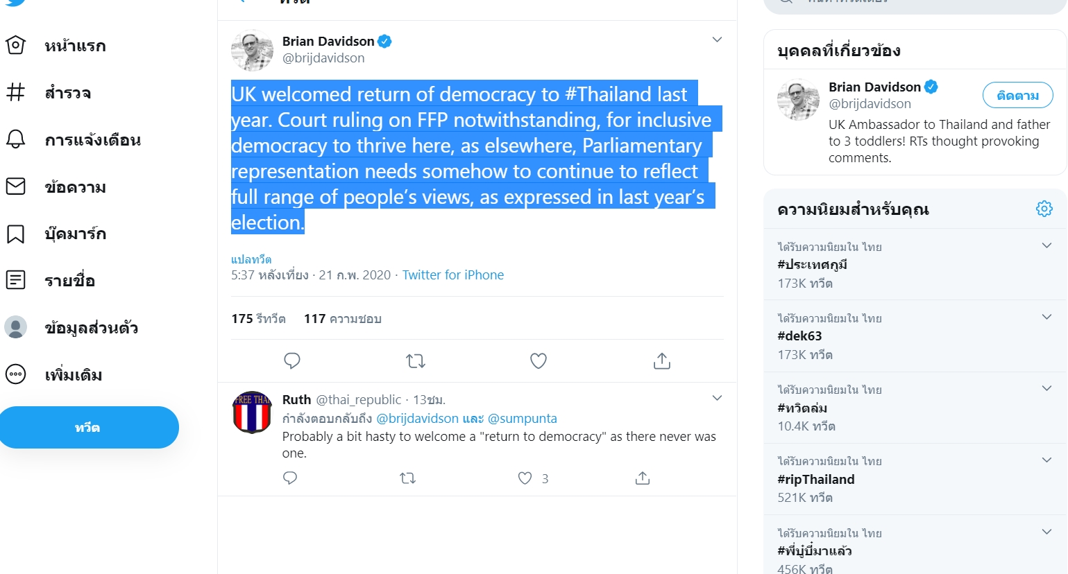 ส่วนนายไบรอัน เดวิดสัน Brian Davidson เอกอัครราชทูตอังกฤษประจำประเทศไทย ก็มีการทวิตข้อความเช่นกัน ระบุว่าในปีที่แล้ว "สหราชอาณาจักรยินดีกับประเทศไทยที่ได้ประชาธิปไตยกลับคืนมา ในตอนนี้คำตัดสินของศาลที่มีต่อพรรคอนาคตใหม่นั้นเป็นการสวนทางและไม่คำนึงถึงความเป็นประชาธิปไตยที่กำลังเบ่งบานขึ้น ดังนั้น สมาชิกสภาผู้แทนราษฎรจะต้องทำหน้าที่อย่างเต็มที่ที่จะสะท้อนความต้องการของประชาชนที่ได้แสดงออกเมื่อช่วงการเลือกตั้งที่ผ่านมา"