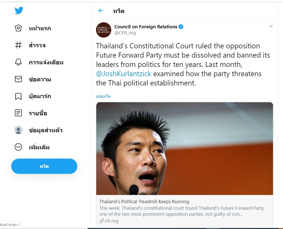 เริ่มกันที่ทวิตเตอร์ของสภาความสัมพันธ์ระหว่างประเทศ (Council of Foreign ) จากประเทศสหรัฐอเมริกา โดยโพสต์ทวิตเตอร์ระบุว่า “ศาลรัฐธรรมนูญไทยได้ตัดสินยุบพรรคอนาคตใหม่ซึ่งเป็นพรรคฝ่ายตรงข้าม และตัดสิทธิ์ทางการเมืองกรรมการบริหารพรรคเป็นเวลา 10 ปี ซึ่งเป็นข้อบ่งชี้ว่าพรรคนั้นมีเป็นภัยต่อฐานอำนาจในการเมืองไทยอย่างไร”
