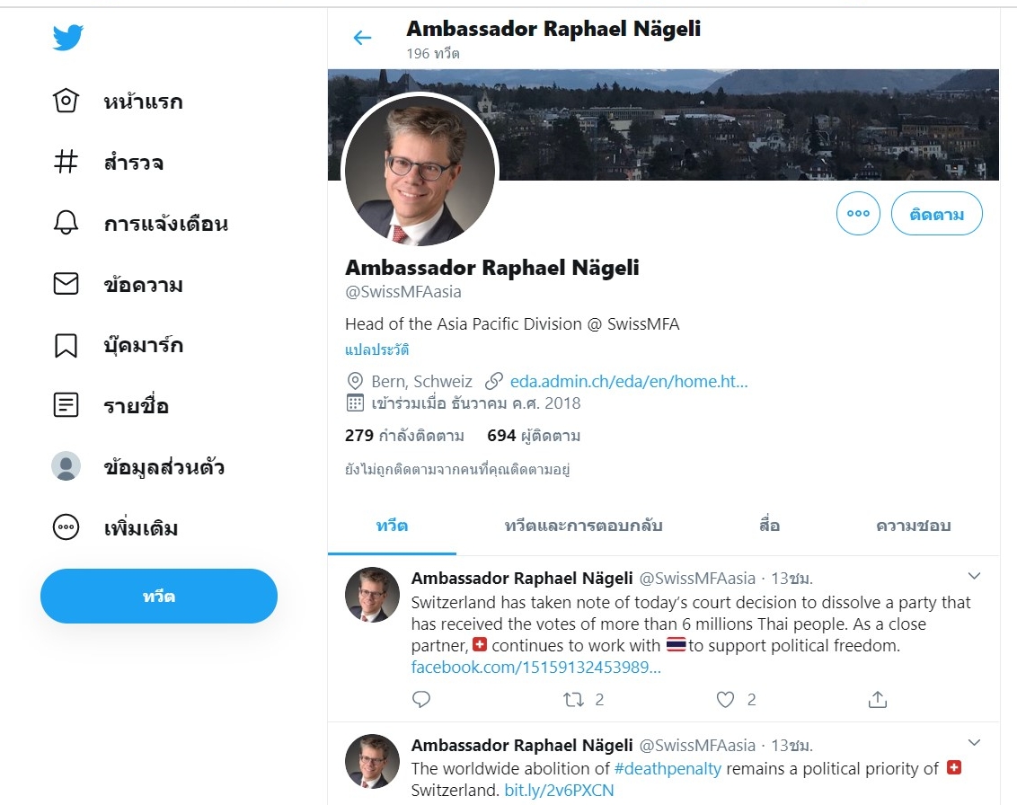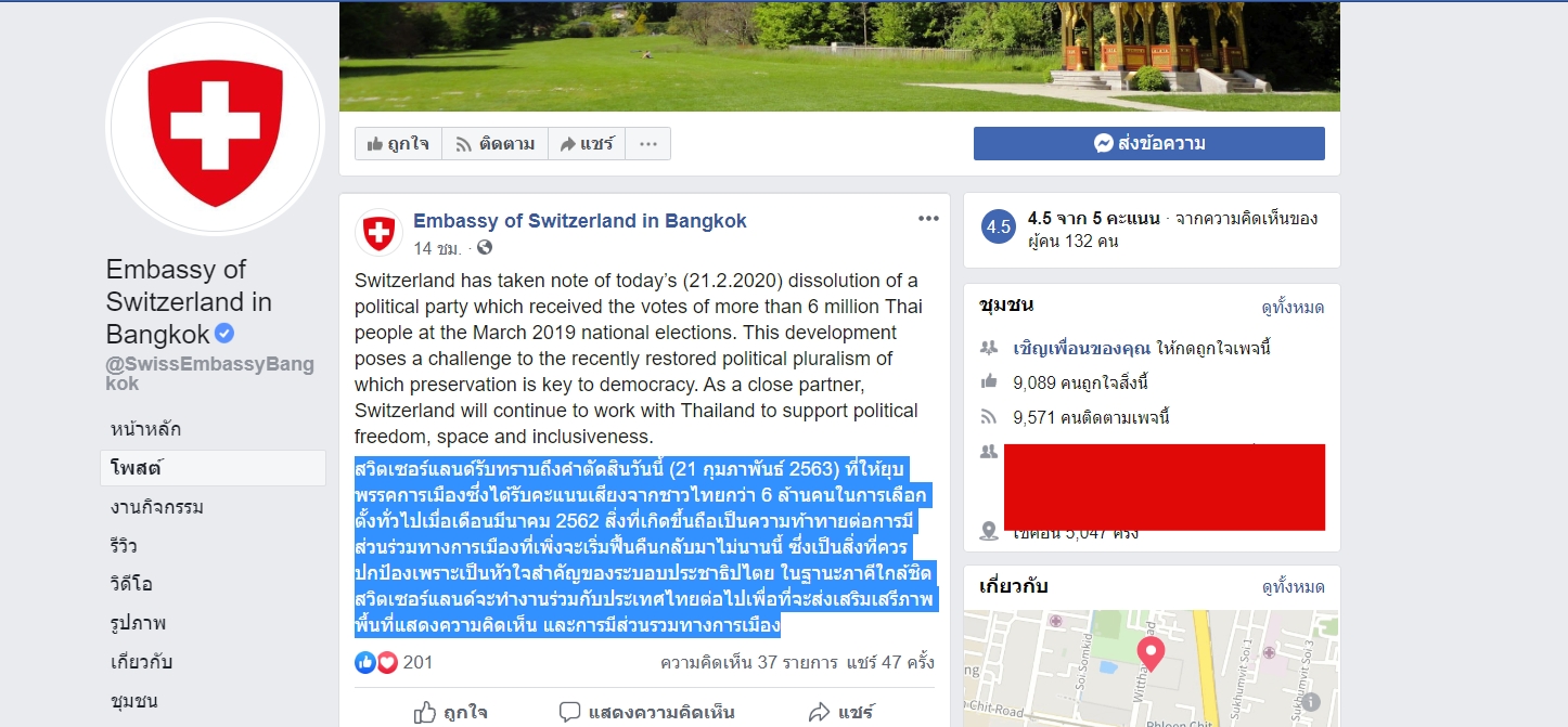 ด้านนาย Raphael Nägeli ผู้ช่วยรัฐมนตรีว่าการกระทรวงการต่างประเทศสวิตเซอร์แลนด์ด้านเอเชียและแปซิฟิก ได้ทวิตข้อความจากสถานทูตสวิตเซอร์แลนด์ประจำประเทศไทยที่ระบุว่า “สวิตเซอร์แลนด์รับทราบถึงคำตัดสินวันนี้ (21 กุมภาพันธ์ 2563) ที่ให้ยุบพรรคการเมืองซึ่งได้รับคะแนนเสียงจากชาวไทยกว่า 6 ล้านคนในการเลือกตั้งทั่วไปเมื่อเดือนมีนาคม 2562 สิ่งที่เกิดขึ้นถือเป็นความท้าทายต่อการมีส่วนร่วมทางการเมืองที่เพิ่งจะเริ่มฟื้นคืนกลับมาไม่นานนี้ ซึ่งเป็นสิ่งที่ควรปกป้องเพราะเป็นหัวใจสำคัญของระบอบประชาธิปไตย ในฐานะภาคีใกล้ชิด สวิตเซอร์แลนด์จะทำงานร่วมกับประเทศไทยต่อไปเพื่อที่จะส่งเสริมเสรีภาพ พื้นที่แสดงความคิดเห็น และการมีส่วนรวมทางการเมือง”