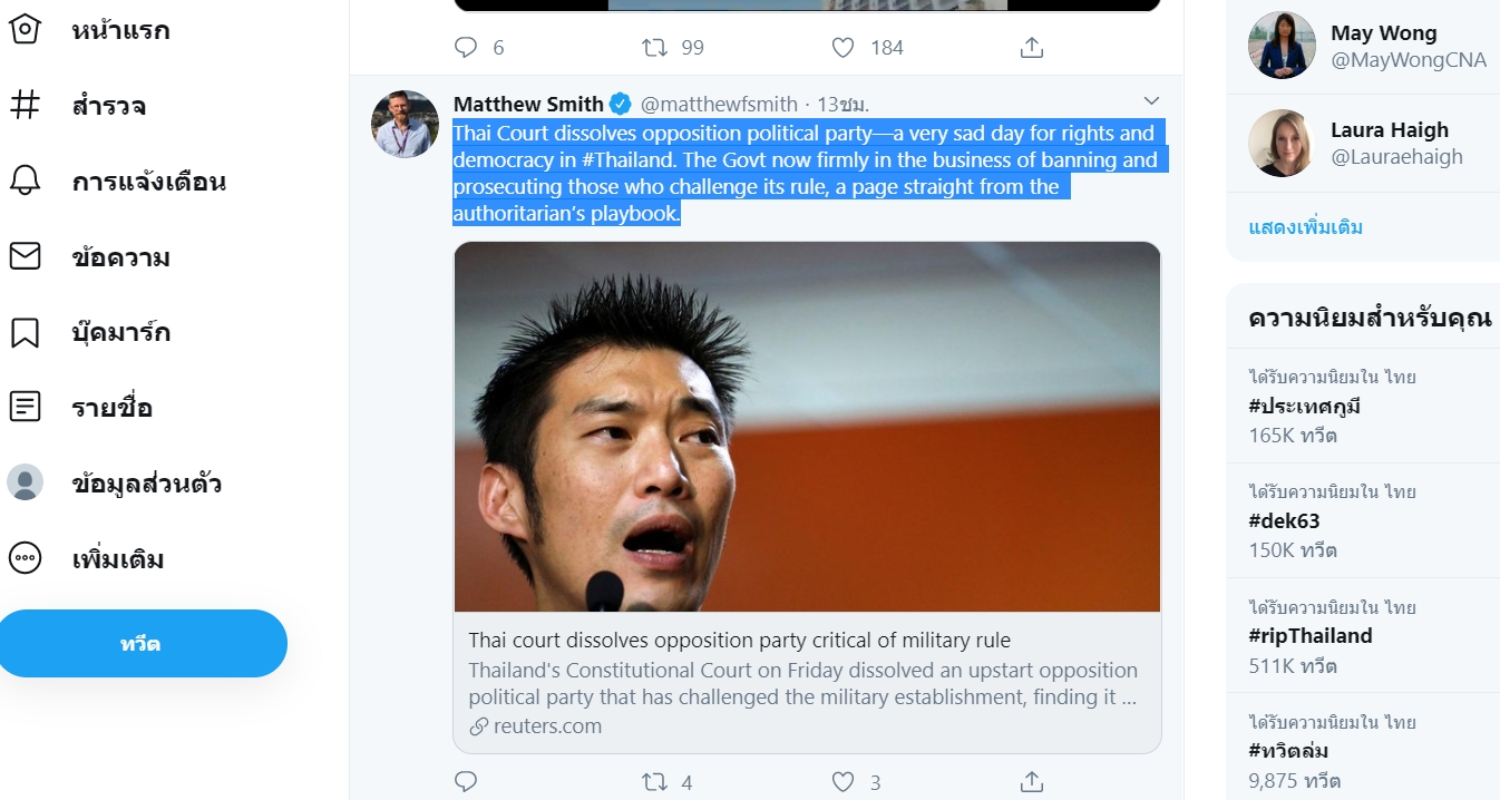 ส่วนทวิตเตอร์ของนายแมทธิว สมิธ (Matthew Smith) ผู้ร่วมก่อตั้งองค์กรโฟร์ติไฟย์ไรท์ (Fortify Rights) องค์กรด้านสิทธิมนษยชน ทวิตว่า “ศาลไทยยุบการเมืองฝ่ายตรงข้าม ถือเป็นวันที่เลวร้ายสำหรับสำหรับสิทธิและประชาธิปไตยในประเทศไทย รัฐบาลไทยตอนนี้นั้นแน่นอนแล้วว่ากำลังอยู่ในภารกิจที่ต้องการจะห้ามและลงโทษผู้ที่ท้าทายกับการปกครองของรัฐบาล ซึ่งนี่ถือเป็นการสั่งตรงมาจากผู้มีอำนาจ”