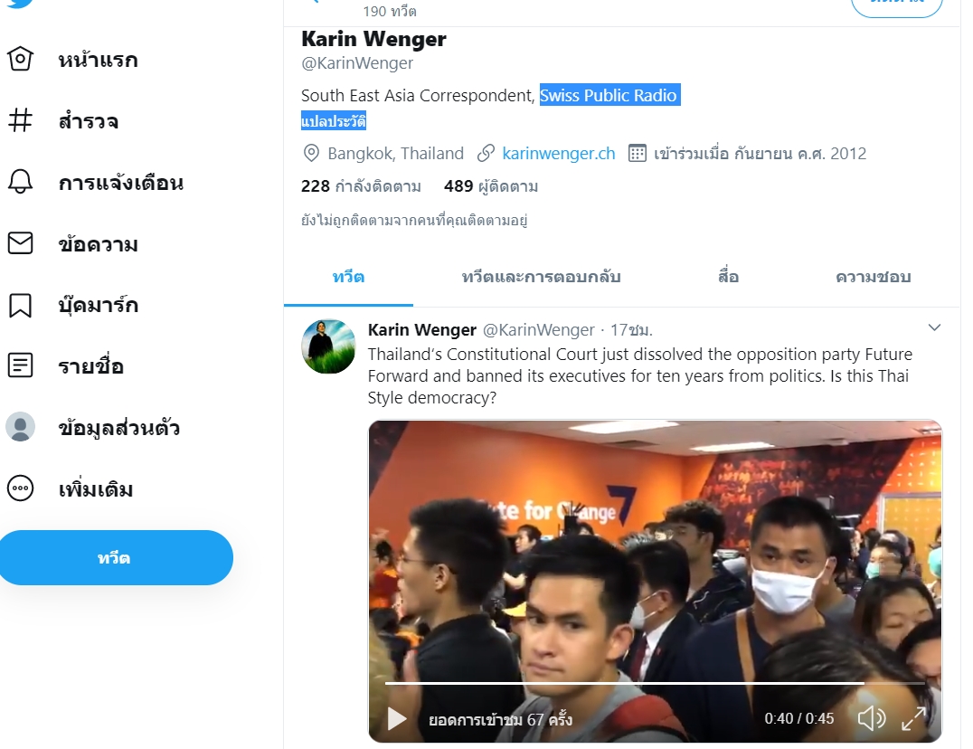 ในส่วนความเห็นจากฝั่งสื่อมวลชนในต่างประเทศนั้น นาง Karin Wenger ผู้สื่อข่าวประจำภูมิภาคเอเชียแปซิฟิก สถานีวิทยุ Swiss Public Radio ซึ่งได้ไปทำข่าวที่พรรคอนาคตใหม่ด้วยตัวเอง ก็ได้โพสต์วิดิโอที่พรรคอนาคตใหม่พร้อมกับทวิตข้อความว่า “ศาลไทยได้ยุบพรรคและตัดสิทธิ์กรรมการบริหารพรรคอนาคตใหม่ 10 ปี หรือนี่จะเป็นสไตล์ของประชาธิปไตยไทย”
