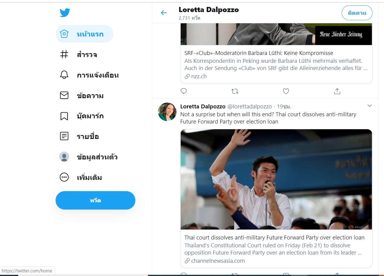 ล่าสุด สำนักข่าวอิศรา (www.isranews.org) สำรวจช่องทางเครือข่ายสังคมออกไลน์ ทวิตเตอร์ (Twitter) โดยพิมพ์คำค้นสำคัญ คำว่า Thai Court Party หรือแปลเป็นไทยว่า ‘ศาล ไทย พรรคการเมือง’ เพื่อสำรวจปฏิกริยาเพิ่มเติมจากความเห็นของชาวต่างชาติบนโลกออนไลน์ นับตั้งแต่ช่วงเวลาที่ศาลรัฐธรรมนูญได้ตัดสินยุบพรรคอนาคตใหม่ จนถึงช่วงประมาณค่ำของวันที่ 22 ก.พ. ที่ผ่านมา