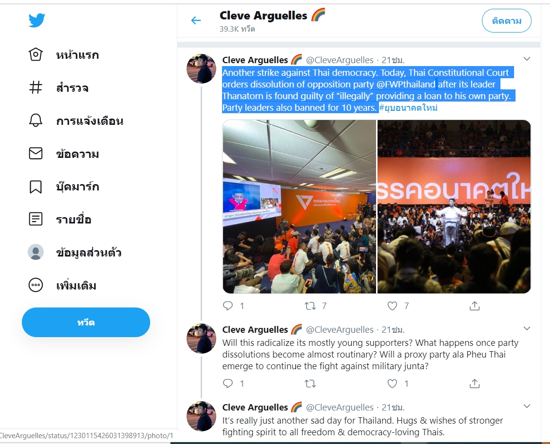 พร้อมกับแนบบทความเก่าๆเกี่ยวข้องกับพรรคอนาคตใหม่ประกอบทวิตเตอร์
