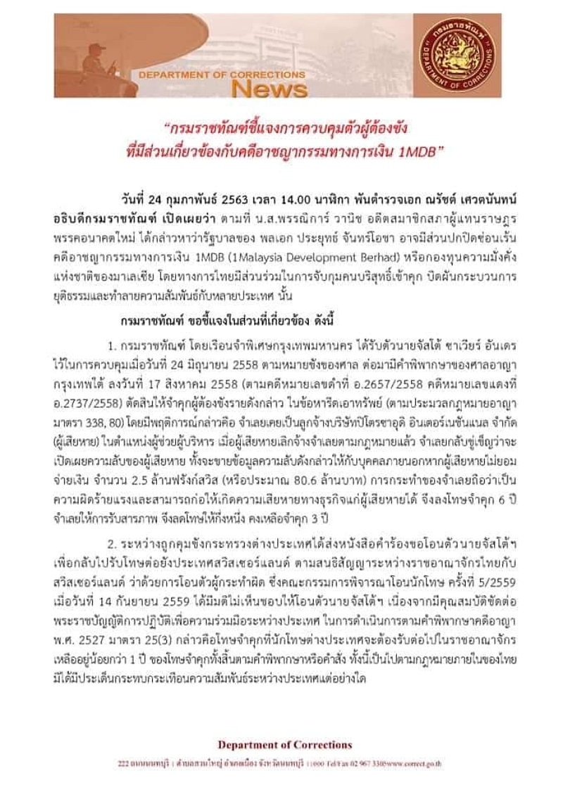 สำนักข่าวอิศรา (www.isranews.org) รายงานว่า เมื่อเวลา 14:00 น. วันที่ 24 ก.พ. 2563 กรมราชทัณฑ์เผยแพร่ข่าวประชาสัมพันธ์เรื่อง “กรมราชทัณฑ์ชี้แจงการควบคุมตัวผู้ต้องขังที่มีส่วนเกี่ยวข้องกับคดีอาชญากรรมทางการเงิน 1MDB” อ้างคำให้สัมภาษณ์ พ.ต.อ.ณรัชต์ เศวตนันทน์ อธิบดีกรมราชทัณฑ์ ระบุว่า ตามที่ น.ส.พรรณิการ์ วานิช อดีตสมาชิกสภาผู้แทนราษฎรพรรคอนาคตใหม่ ได้กล่าวหาว่า รัฐบาลของ พล.อ.ประยุทธ์ จันทร์โอชา อาจมีส่วนปกปิดซ่อนเร้นคดีอาชญากรรมทางการเงิน 1MDB (1 Malaysia Development Berhad) หรือกองทุนความมั่งคั่งแห่งชาติของมาเลเซีย โดยทางการไทยมีส่วนร่วมในการจับกุมคนบริสุทธิ์เข้าคุก บิดผันกระบวนการยุติธรรมและทำลายความสัมพันธ์กับหลายประเทศ นั้น