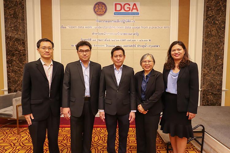 นายวิบูลย์ ภัทรพิบูล (ที่ 3 จากซ้าย) รองผู้อำนวยการสำนักงานพัฒนารัฐบาลดิจิทัล (องค์การมหาชน) หรือ DGA เป็นประธานในการอบรมเชิงปฏิบัติการ “Open data work: understanding open data usage from a practice lens” สำหรับพนักงานและข้าราชการภาครัฐ โดยมีวัตถุประสงค์เพื่อสร้างความรู้และความเข้าใจเกี่ยวกับแนวทางการเปิดเผยข้อมูลเปิดภาครัฐในรูปแบบดิจิทัลต่อสาธารณะ การนำข้อมูลขึ้นเผยแพร่และร่วมประชุมเพื่อระดมความคิด เพื่อให้การเปิดเผยข้อมูลของหน่วยงานสามารถดำเนินการไปได้อย่างเป็นรูปธรรม สร้างความรู้ความเข้าใจในการนำข้อมูลเผยแพร่ผ่าน “ศูนย์กลางการให้บริการข้อมูลเปิดภาครัฐ (Open Government Data) ภายใต้ชื่อ data.go.th” เพื่อเป็นแนวทางในการดำเนินการเกี่ยวกับการเปิดเผยข้อมูลภาครัฐ Open Government Data ตลอดจนเพื่อเป็นการส่งเสริมและสนับสนุนการมีส่วนร่วมในการสร้างนวัตกรรมจากการใช้ข้อมูลเปิดภาครัฐให้เกิดประโยชน์ และสามารถต่อยอดนวัตกรรมบริการ ณ โรงแรม เดอะ เบอร์เคลีย์ โฮเต็ล ประตูน้ำ กรุงเทพ เมื่อเร็วๆ นี้