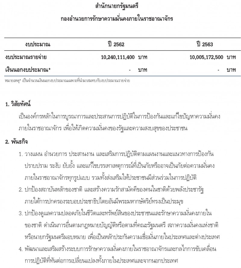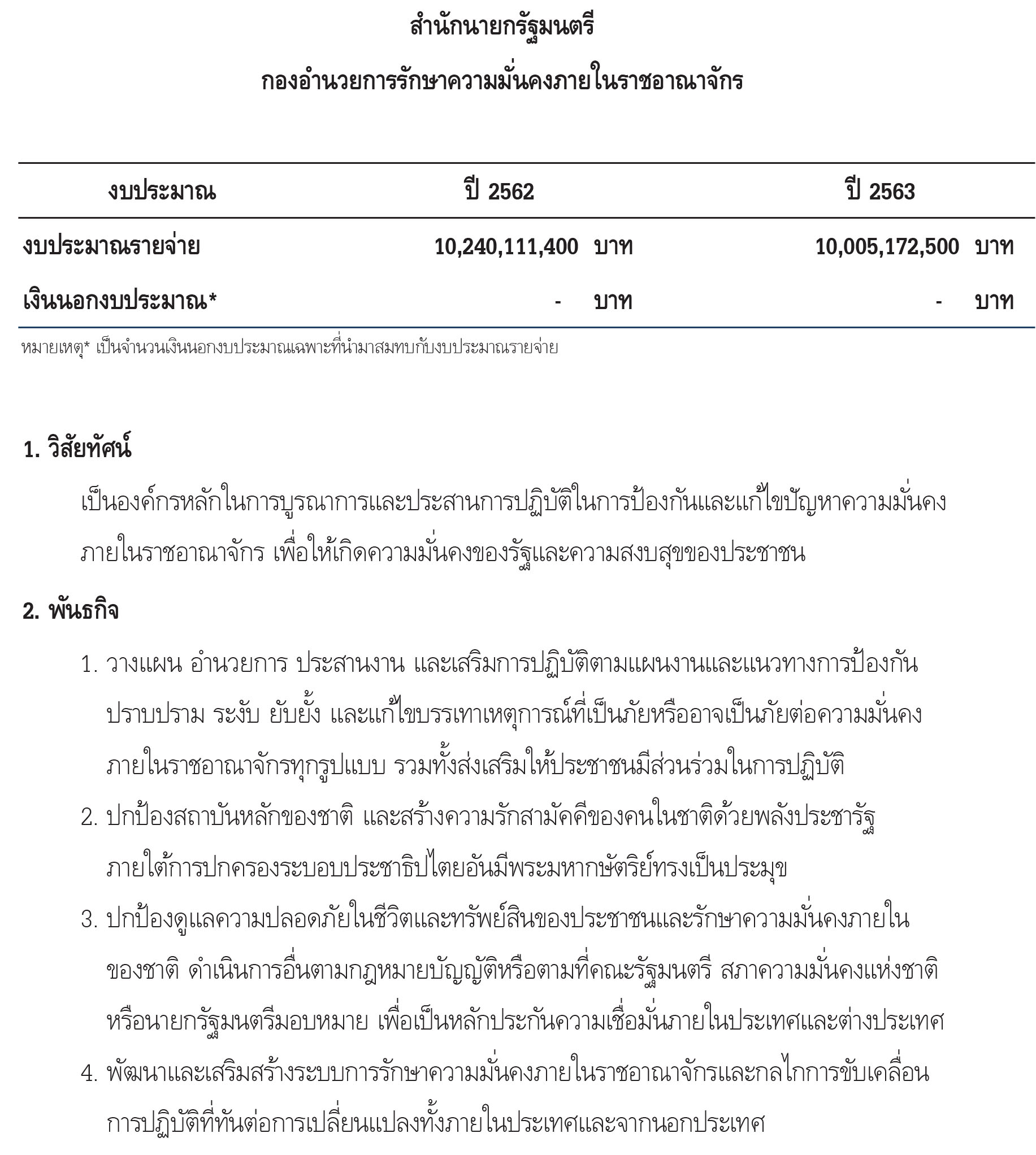 เมื่อเจาะลึกข้อมูลในส่วนงบประมาณ ปี 2562 ระบุเป็นค่าใช้จ่ายในการดำเนินการภาครัฐ จำนวน 835.01 ล้านบาท, งานตามภารกิจสังคมมีความมั่นคง ประชาชนปลอดภัยมีกลไกขับเคลื่อนการป้องกันปราบปราม ระงับยับยั้งและแก้ไขเหตุการณ์ที่เป็นภัยต่อความมั่นคง 4,859.13 ล้านบาท, ลดความขัดแย้งภาคการเมืองและภาคประชาชน โดยสร้างการรับรู้ในทุกระดับตามช้องทางต่างๆ 349.07 ล้านบาท, ปัญหาความมั่นคงที่มีอยู่ในปัจจุบันได้รับการแก้ไขจนไม่ส่งผลกระทบต่อการบริหารและพัฒนาประเทศ 16.0 ล้านบาท, ภาคใต้มีความสงบสุขร่มเย็น 3,974.19 ล้านบาท, เด็ก เยาวชน ผู้ใช้แรงงานและประชาชน ได้รับการสร้างภูมิคุ้มกันป้องกันยาเสพติด 206.64 ล้านบาท