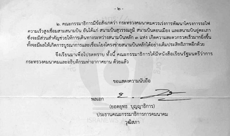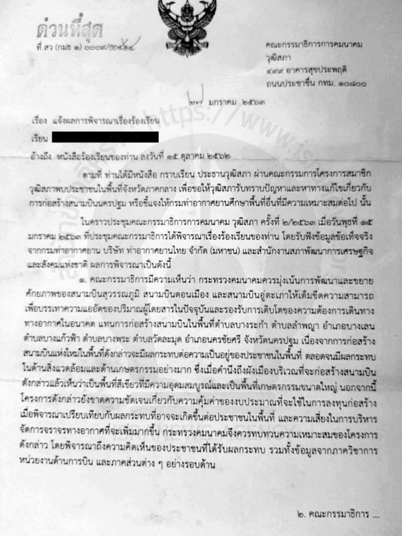เผยหนังสือกมธ.คมนาคม ค้านสร้างสนามบินนครปฐม ชี้ความคุ้มค่างบประมาณยังไม่ชัดเจน-ควรฟังเสียงปชช. แนะควรพัฒนาสนามบินสุวรรณภูมิ-ดอนเมือง-อู่ตะเภาให้เต็มประสิทธิภาพก่อน