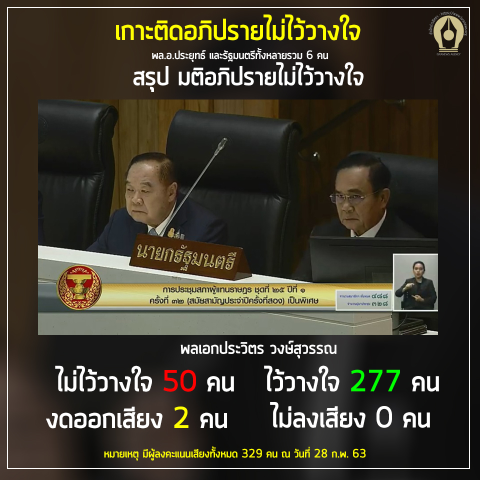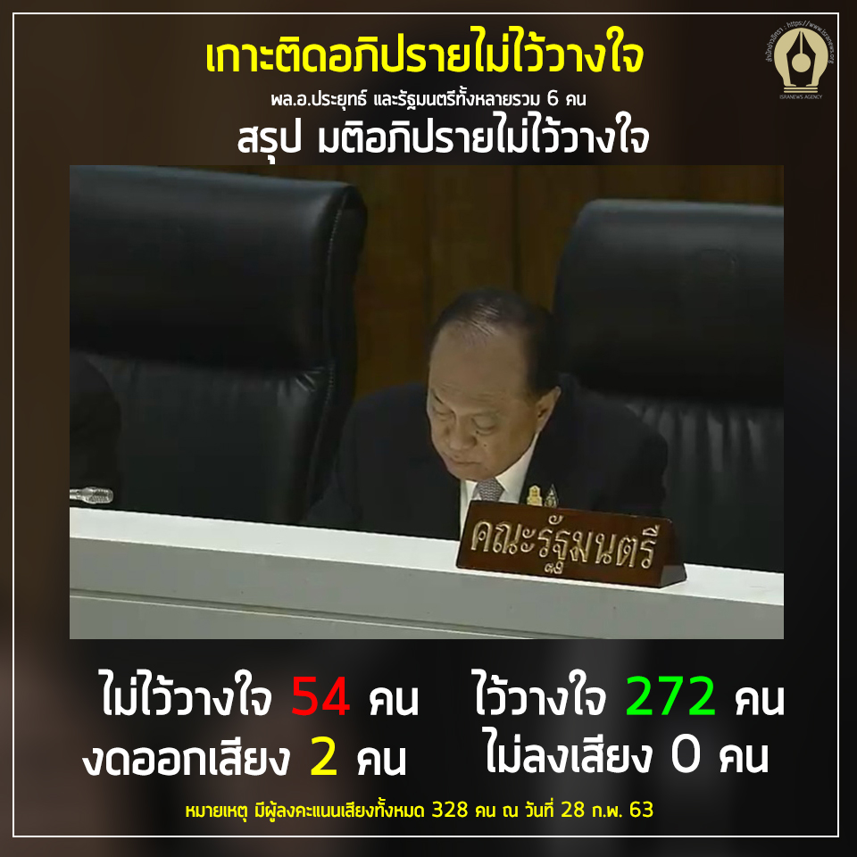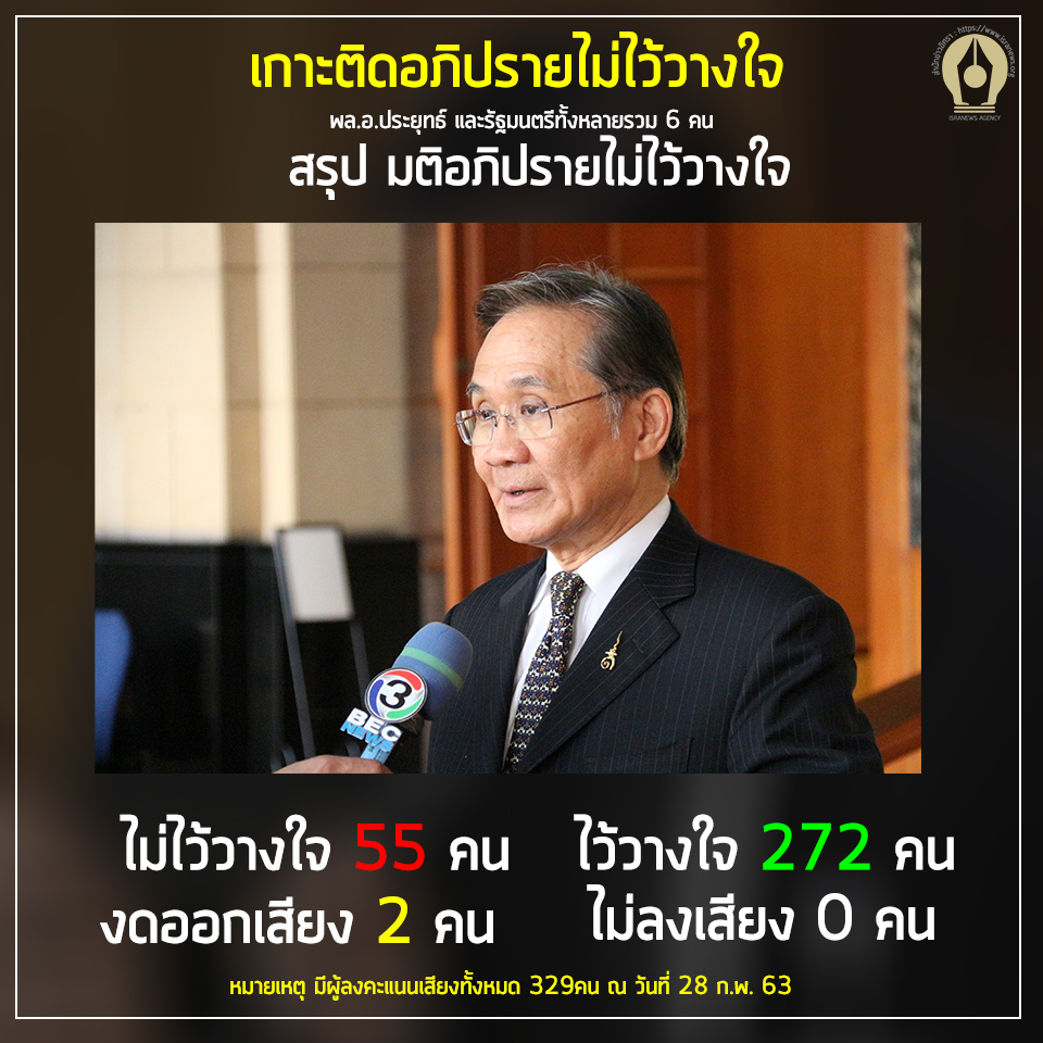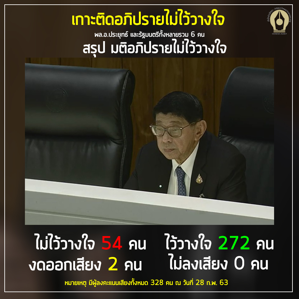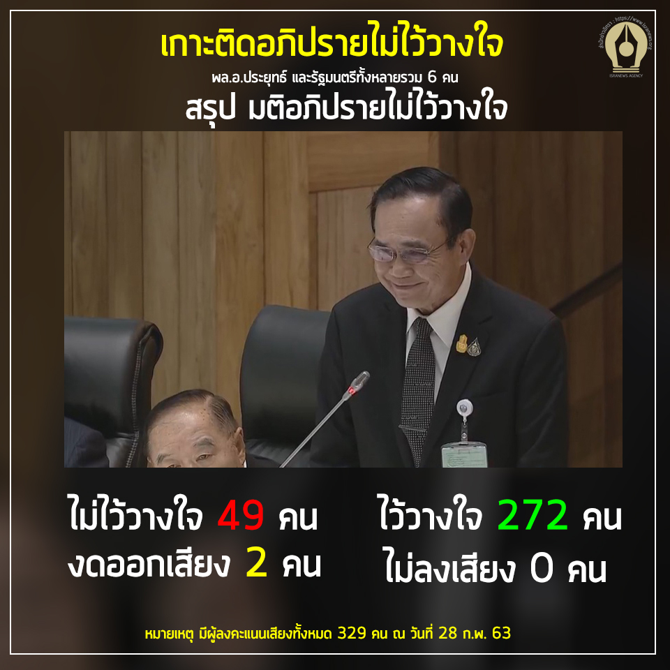 โดย พล.อ.ประยุทธ์ ที่ประชุมไม่ไว้วางใจ 49 เสียง ไว้วางใจ 272 เสียง งดออกเสียง 2 ราย จากผู้เข้าประชุม 323 ราย
