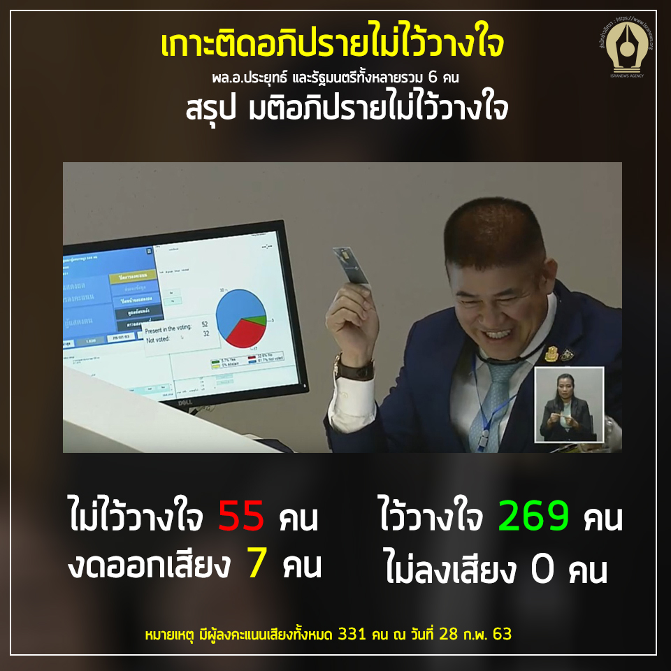 โดย ร.อ.ธรรมนัส ที่ประชุมไม่ไว้วางใจ 55 เสียง ไว้วางใจ 269 เสียง งดออกเสียง 7 ราย จากผู้เข้าประชุม 331 ราย