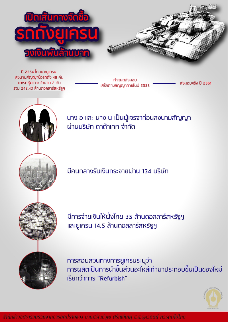 "...ข้อเท็จจริงการจัดซื้อรถถังดังกล่าวระบุว่าเป็นการจัดซื้อระหว่างรัฐบาลกับรัฐบาล (จีทูจี) แต่พบวา ไม่ใช่จีทูจีจริง ซึ่งผลการสอบสวนชี้ว่า นาง อ. และ นาง น. เป็นผู้เจรจาก่อนทำสัญญาของฝั่งไทย ผ่าน บริษัท ดาต้าเกท จำกัด โดยมีคนกลางได้รับเงินไปกระจายผ่าน 134 บริษัท มีการจ่ายเงินให้ฝั่งไทย 35 ล้านดอลลาร์สหรัฐอเมริกา คิดเป็นเงินไทยประมาณ 1 พันล้านบาท และมีการจ่ายให้ฝั่งยูเครน 14.5 ล้านดอลลาร์สหรัฐฯ โดยการบริหารการจ่ายเงินทุกฝ่ายมี นาง อ. เป็นคนจัดการ หลังจากนั้นจึงลาออกจากการปลอมตัวเป็นเจ้าหน้าที่พิเศษฝั่งไทยในสถานทูตยูเครน โดยเรื่องนี้เจ้าหน้าที่ด้านความมั่นคงของยูเครนได้ส่งเรื่องมากระทรวงการต่างประเทศ เพื่อให้ทำการสอบสวน แต่ไม่ได้มีการสอบสวนแต่อย่างใด..."