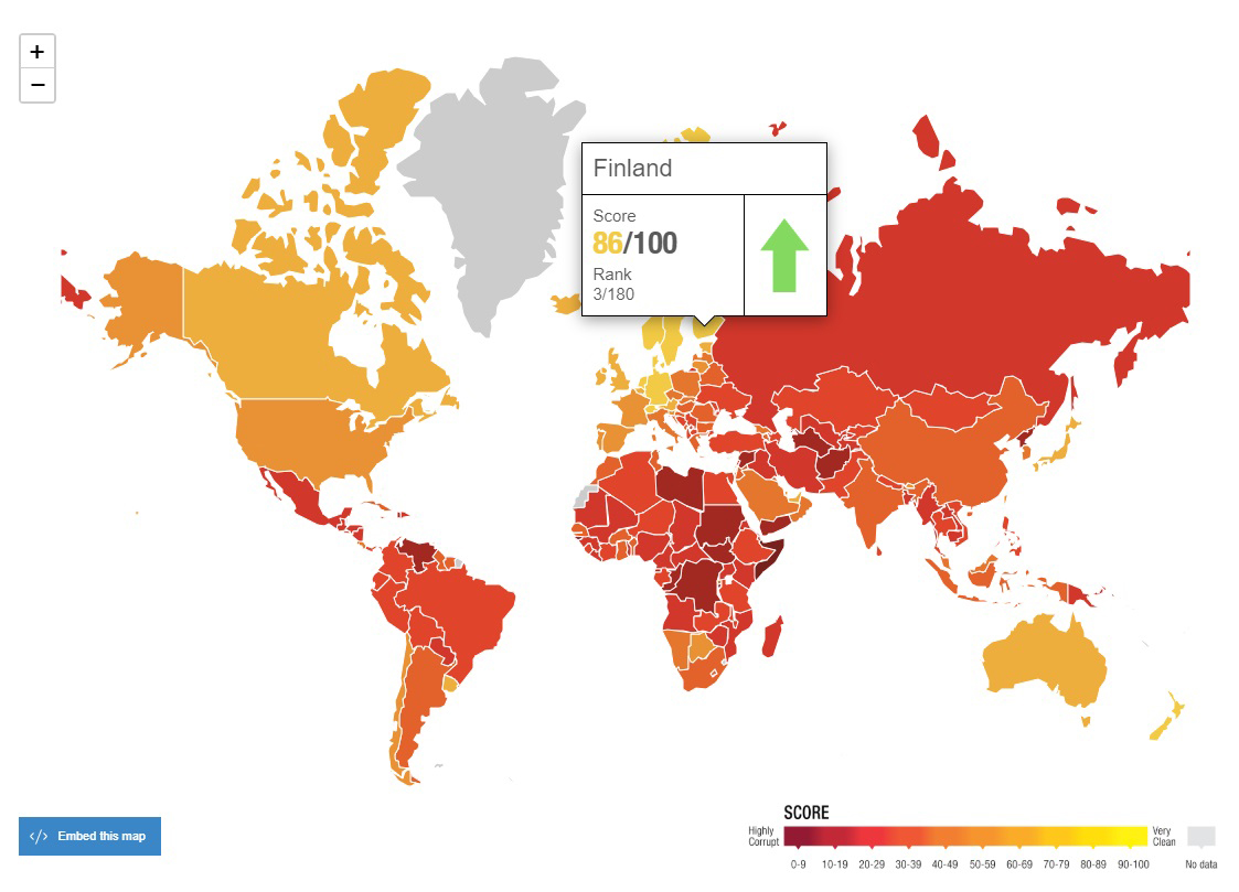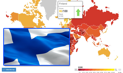 (ผลคะแนน CPI ปี 2019 จากการจัดอันดับของ TI พบว่าฟินแลนด์ได้ 86 คะแนนอยู่ลำดับ 3 ของโลก)
