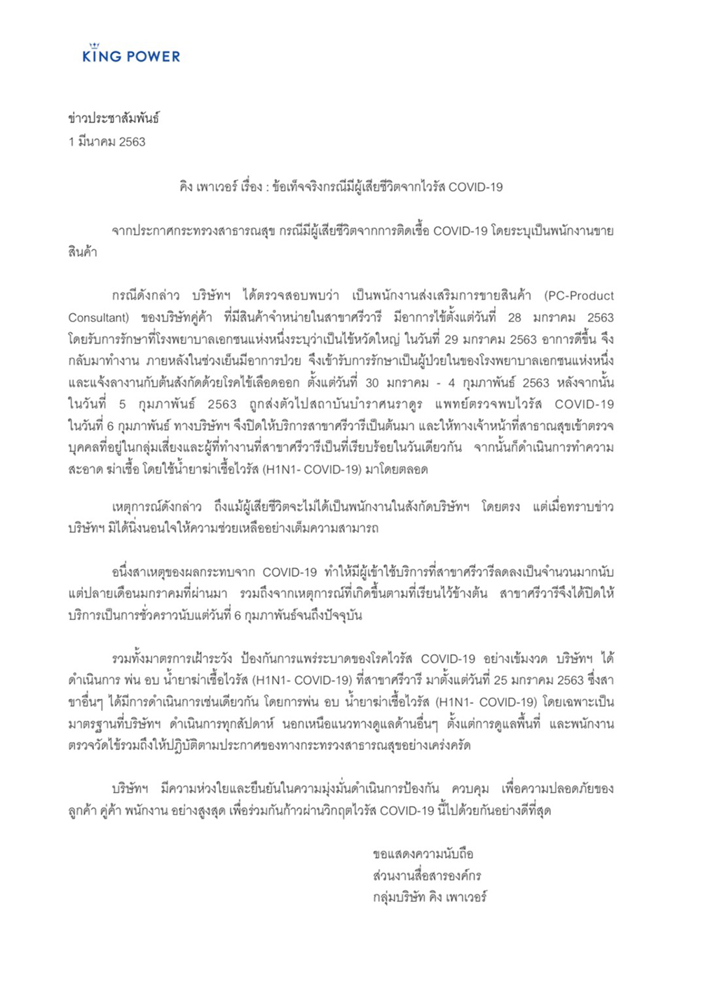 สำนักข่าวอิศรา (www.isranews.org) รายงานว่า เมื่อวันที่ 1 มี.ค. ส่วนงานสื่อสารองค์กร กลุ่มบริษัท คิง เพาเวอร์ ได้ชี้แจงข้อเท็จจริงกรณีมีผู้เสียชีวิตจากไวรัส COVID-19 ว่า จากประกาศกระทรวงสาธารณสุข กรณีมีผู้เสียชีวิตจากการติดเชื้อ COVID-19 โดยระบุเป็นพนักงานขายสินค้า