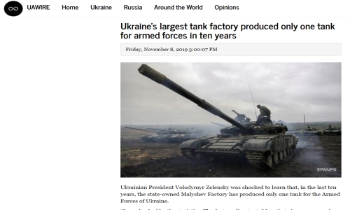 ระบุว่า นายโวโลโดเมียร์ เซเลนสกี ประธานาธิบดียูเครนต้องตกใจเป็นอย่างมาก เมื่อรับรู้ว่าในช่วงตลอด 10 ปีที่ผ่านมา โรงงานรัฐวิสาหกิจของรัฐบาลที่มีชื่อว่าโรงงานมาลีเชฟ (Malyshev Factory) สามารถผลิตรถถังเพียงแค่ 1 คันเท่านั้น ให้กับกองกำลังป้องกันประเทศยูเครน