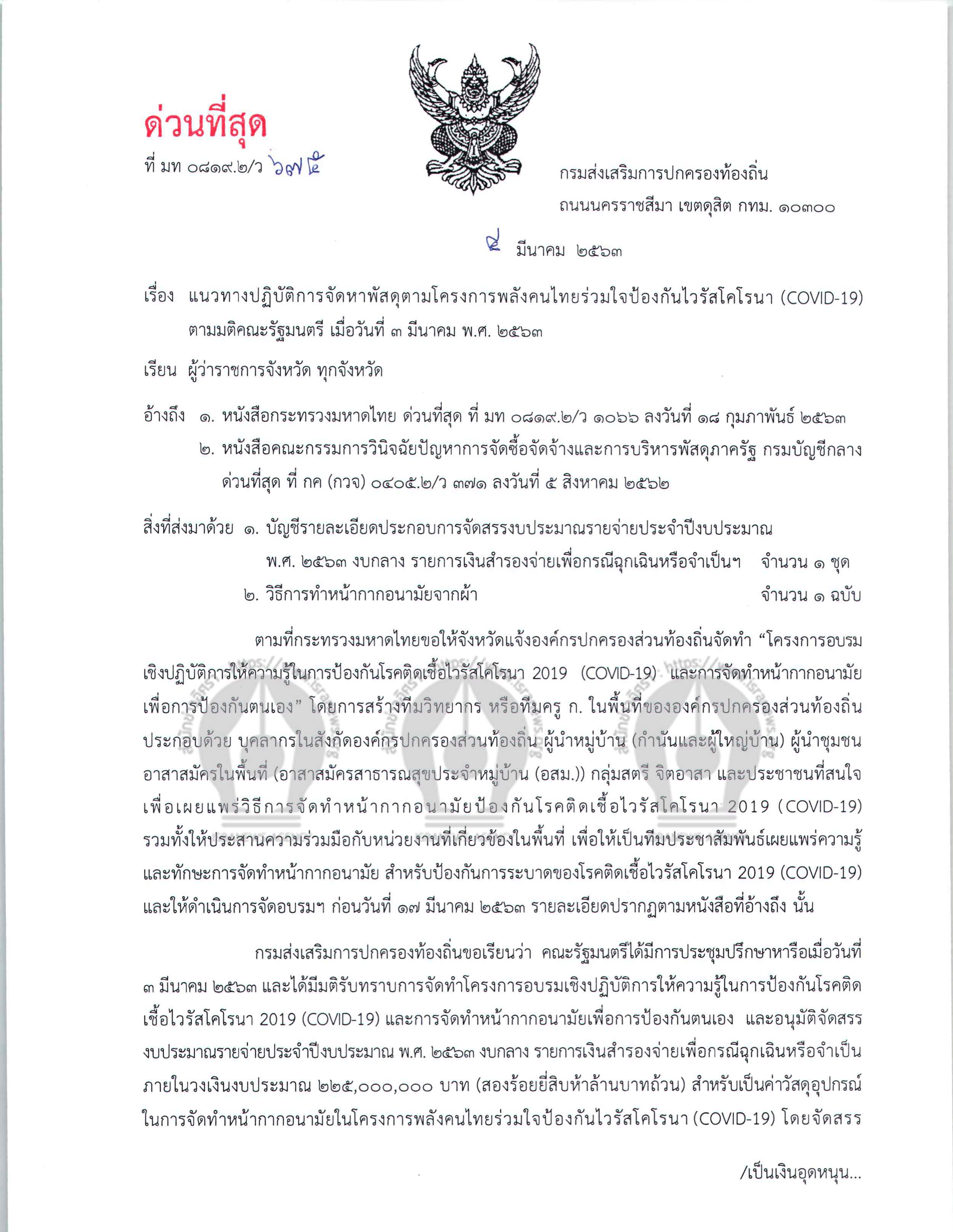 สืบเนื่องจากที่ประชุมคณะรัฐมนตรี (ครม.) เมื่อวันที่ 3 มี.ค.2563 ที่ผ่านมา มีมติเห็นชอบอนุมัติงบประมาณ ”โครงการพลังคนไทยร่วมใจป้องกันไวรัสโคโรนา” วงเงิน 225 ล้านบาท มีวัตถุประสงค์เพื่อการผลิตหน้ากากผ้าให้เป็นอีกทางเลือกแทนหน้ากากอนามัย มีองค์กรปกครองส่วนท้องถิ่นเป็นผู้รับผิดชอบ ประชาชนผู้ผ่านการอบรมจากเจ้าหน้าที่อาสาสมัครสาธารณสุขประจำหมู่บ้าน (อสม) เป็นผู้ผลิตตามมาตรฐานกระทรวงฯ เป้าหมายการผลิต 50 ล้านชิ้น มีต้นทุนชิ้นละ 4.50 แจกจ่ายกับประชาชนทั่วไปฟรี