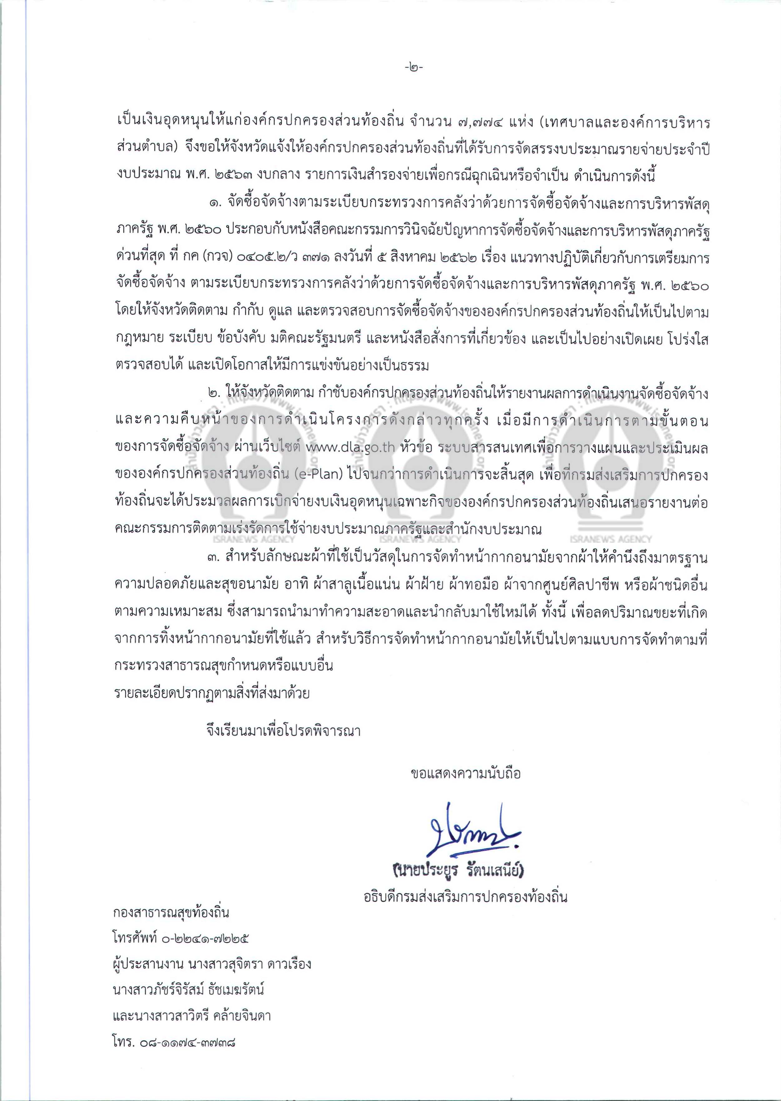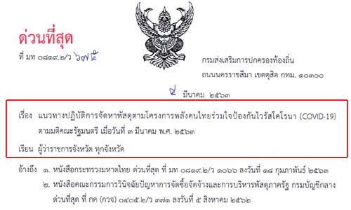 เผยหนังสือ สถ. แจ้งเวียน ผู้ว่าฯ ทุกจังหวัด คุมเข้ม อปท. ใช้งบ 225 ล. ผลิตหน้ากากอนามัยผ้า 50 ล้านชิ้น แจกฟรี ปชช. ย้ำกระบวนซื้อจ้างให้เป็นไปตามกม.ระเบียบ ข้อบังคับ มติครม. ต้องแข่งขันอย่างเป็นธรรม เปิดเผยโปร่งใสตรวจสอบได้ ระบุลักษณะผ้าที่ใช้คำนึงถึงมาตรฐานความปลอดภัย-สุขอนามัย สามารถนำมาทำความสะอาดกลับมาใช้ได้ใหม่ เพื่อลดปริมาณขยะ