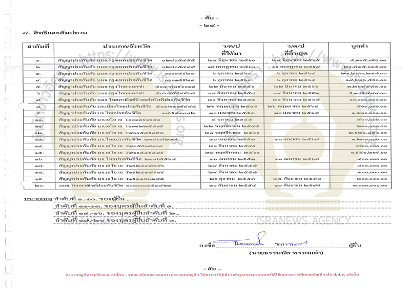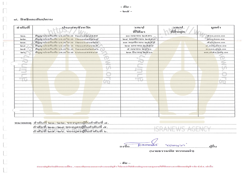 ขณะที่ตามปกติในการยื่นบัญชีแสดงรายการทรัพย์สินและหนี้สิน หากมีการเช่าอะไร จะแจ้งไว้ในส่วนของสิทธิและสัมปทาน ทั้งนี้ ร.อ.ธรรมนัส แจ้งว่ามีสิทธิและสัมปทาน มูลค่า 92,417,394 บาท โดยพบว่าเป็นสัญญาประกันภัย และสัญญาประกันชีวิตทั้งหมด 26 รายการ (ดูเอกสารประกอบ)