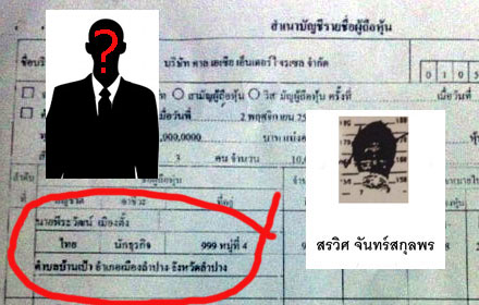 ณ วันที่ 2 พ.ย.56 นาย พีระวัฒน์ เมืองตั้ง แจ้งที่อยู่บ้านเลขที่ 999 หมู่ 4 ต.บ้านเป้า อ.เมืองลำปาง จ.ลำปาง อายุ 24 ปี (ในขณะนั้น) ถือหุ้นใหญ่สุด จำนวน 9,998 หุ้น มูลค่า 999,800 บาท