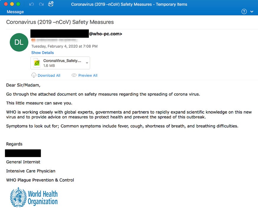 ที่ผ่านมา เว็บไซต์ Vox Media ซึ่งเป็นเว็บไซต์สื่อออนไลน์ของสหรัฐอเมริกา เคยเผยแพร่ข้อมูลบางส่วนของอีเมลหลอกลวง ในลักษณะการแจ้งส่งเอกสารอ้างว่าเป็นคำเตือนจากทาง WHO ถึงข้อปฏิบัติที่ควรกระทำในช่วงที่มีการระบาดของไวรัส แต่เมื่อกดเข้าไปแล้วก็จะเป็นการดาวน์โหลดมัลแวร์เพื่อจะเอาข้อมูลของผู้ที่รับอีเมล