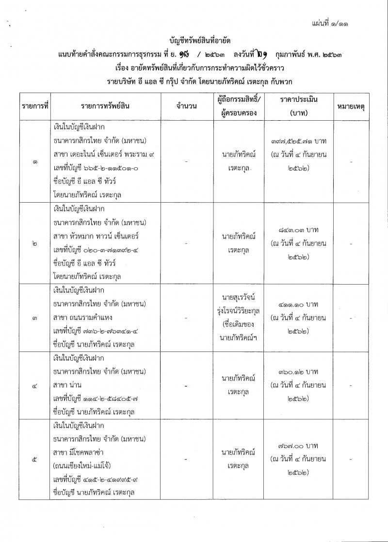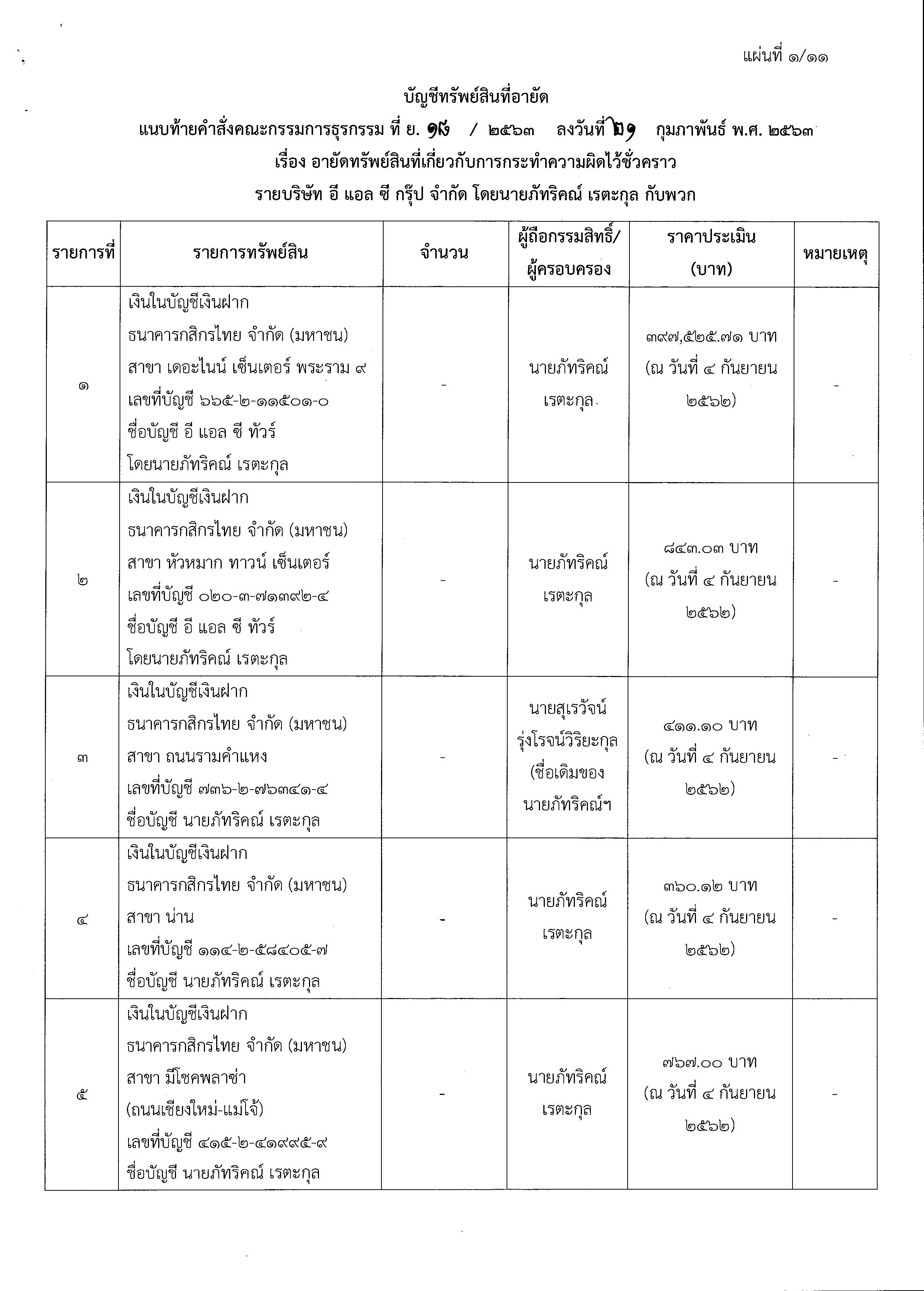 ทั้งนี้ ทรัพย์สินที่ถูกอายัด ตามที่คำสั่งคณะกรรมการธุรกรรม ที่ ย.18/2563 ได้แก่ เงินฝากธนาคาร ที่ดินตามโฉนด ห้องชุด หุ้นในบริษัทต่าง อยู่ในชื่อบริษัท อี แอล ซี กรุ๊ป ,นายภัทริคณ์ เรตะกุล, นางขันทอง ดีพิชัย ,นางพนมพร ดีสีใส ,นายสาธิต วงศ์ชมสิน ,นายสารนาถ สุภา จำนวน 58 รายการ มูลค่า 44,669,854.75 บาท