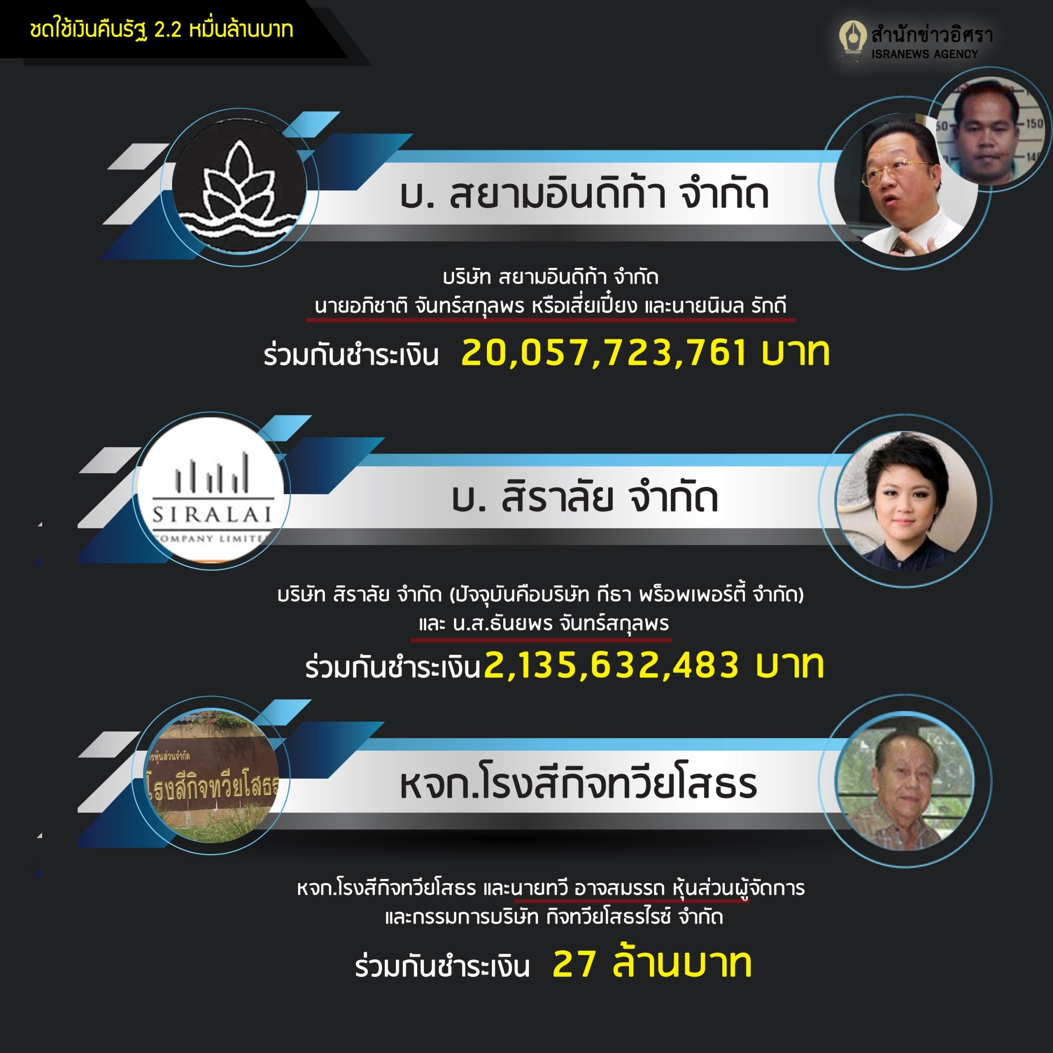 หมายเหตุ สำนักข่าวอิศรา www.isranews.org : จำแนกจำเลย-โทษรายคน คดีระบายข้าวแบบรัฐต่อรัฐ (จีทูจี) โดยทุจริต ภายหลังศาลฎีกาแผนกคดีอาญาของผู้ดำรงตำแหน่งทางการเมือง มีคำพิพากษาเมื่อวันที่ 25 ส.ค. 2560 และคำวินิจฉัยอุทธรณ์ขององค์คณะที่ประชุมใหญ่ศาลฎีกาพิพากษาแก้ เมื่อวันที่ 6 ก.ย. 2562 จำคุกจำเลยรวม 20 คน และสั่งปรับเงิน รวมถึงให้บริษัทเอกชนเครือสยามอินดิก้า และเอกชนโรงสีค้าข้าว อีก 8 แห่ง ชดใช้ค่าเสียหายรวมกว่า 2 หมื่นล้านบาท