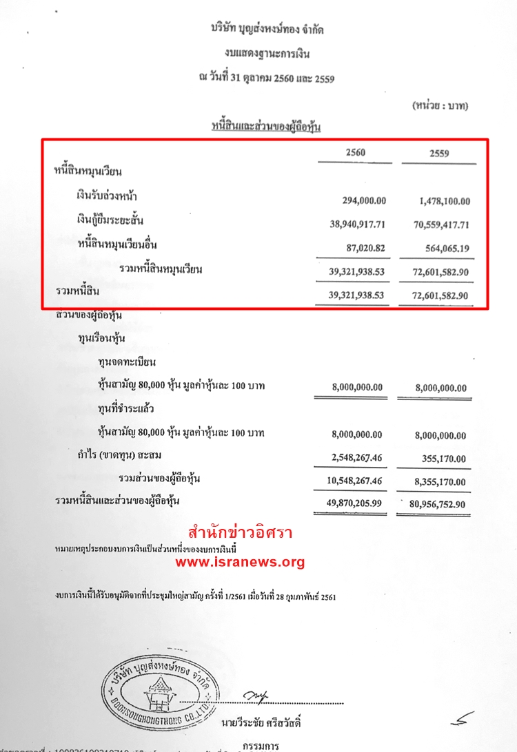 "...สำหรับข้อมูลเกี่ยวกับงบการเงิน จากการตรวจสอบงบดุล ที่บริษัท บุญส่งหงษ์ทอง จำกัด แจ้งไว้กับกรมพัฒนาธูรกิจการค้า 2 ปี คือ ปี 2559 -2560 พบว่า ข้อมูลสินทรัพย์ปี 60 ลดลงจากปี 59 เท่าตัว เช่นเดียวกับหนี้สิน แต่ที่น่าสนใจ คือ ในปี 59 บริษัทฯ แจ้งว่า เงินกู้ยืมระยะสั้นจากบุคคลที่เกี่ยวข้อง 70,559,417.71 บาท..."