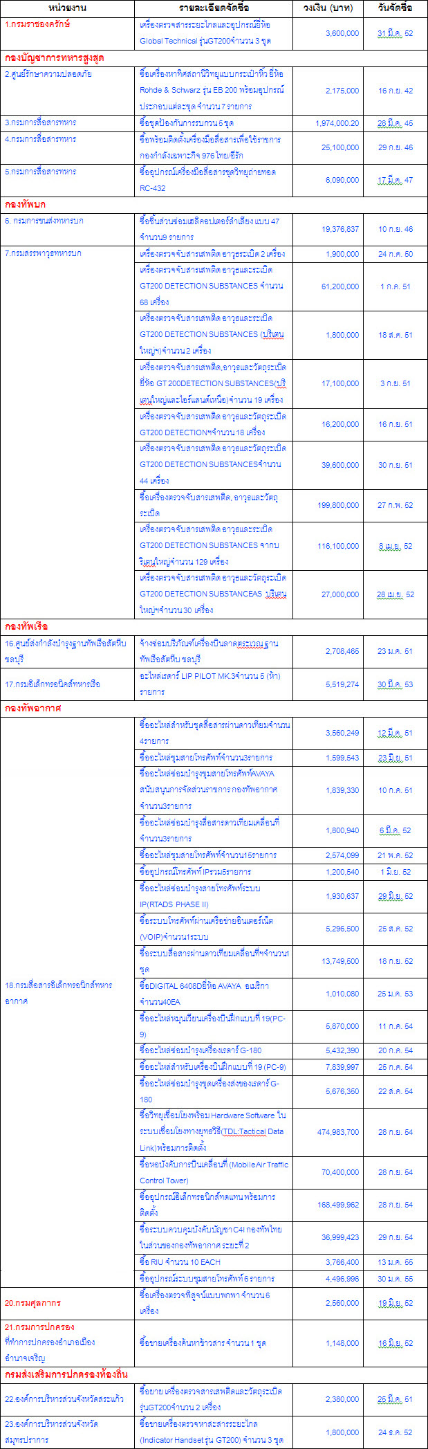 แม้ว่ากรมสอบสวนคดิเศษ (ดีเอสไอ)และผู้เชี่ยวชาญจากหน่วยงานของรัฐรวมถึงนักวิชาการออกระบุว่าเครื่องตรวจจับสารเสพติด อาวุธและระเบิด GT 200 ที่กองทัพและหน่วยงานของรัฐหลายแห่งจัดซื้อจากบริษัท เอวิเอ แซทคอม จำกัด เพื่อนำไปใช้ปฏิบัติงานในพื้นที่ 3 จังหวัดชายแดนภาคใต้ ไม่สามารถใช้งานได้มีประสิทธิภาพและกระบวนการจัดซื้อส่อว่ามีการสมยอมราคาระหว่างเอกชนที่เสนอขายให้แก่หน่วยงานของรัฐที่จัดซื้อ (เอกชนเป็นกลุ่มเดียวกัน) แต่ทว่าหน่วยงานในกองทัพได้ซื้ออุปกรณ์สื่อสารและอื่นๆจากเอกชนรายดังกล่าว เป็นเงินทั้งสิ้น 1,365,770,213 ในจำนวนนี้เป็นกองทัพอากาศถึง 818,526,636 บาท ที่เหลือเป็นกองทัพบก (เครื่อง GT 200 ) กองทัพเรือ กรมศุลกากร กรมการปกครอง และ กรมส่งเสริมการปกครองท้องถิ่น (ดูตาราง)