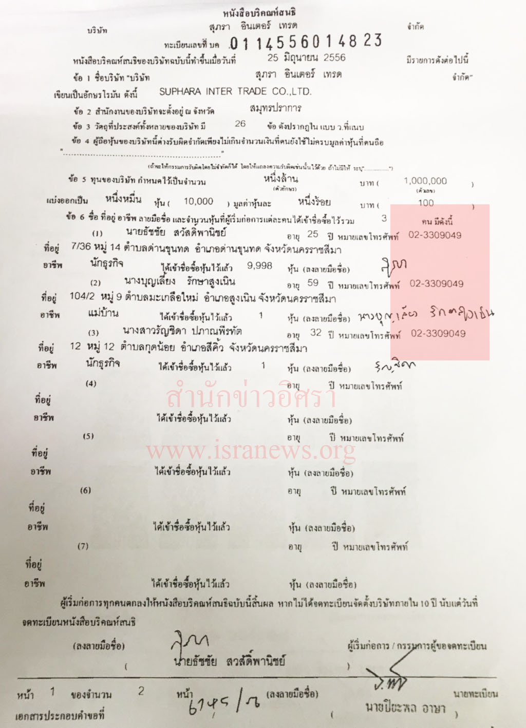 ล่าสุด สำนักข่าวอิศรา ตรวจสอบเอกสารหลักฐานจดทะเบียนจัดตั้งบริษัท สุภรา อินเตอร์ เทรด จำกัด ที่แจ้งไว้กับกรมพัฒนาธุรกิจการค้า พบว่า มีการระบุหมายเลขโทรศัพท์ ติดต่อบริษัท ผู้ถือหุ้นบริษัท รวมไปถึงพยานในการจดทะเบียนจัดตั้งไว้หมายเลขเดียวกัน คือ 02-3309049 (ดูเอกสารประกอบ)