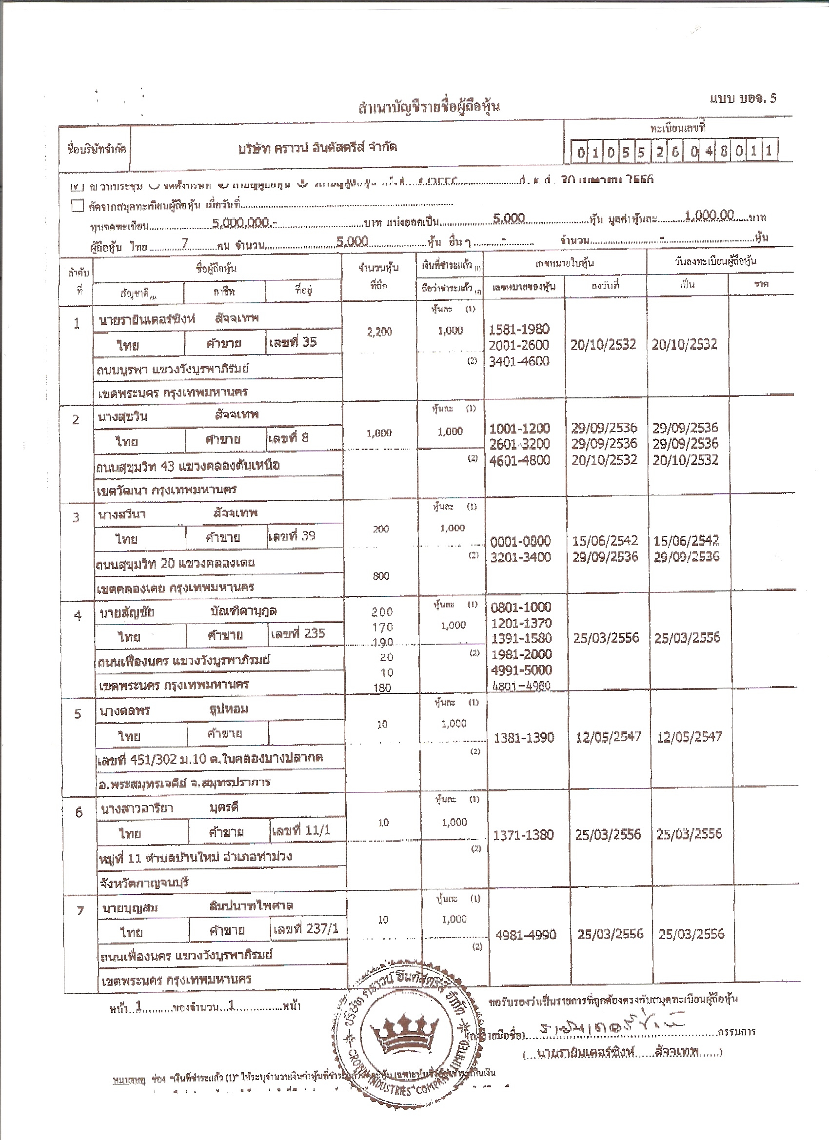 ขณะที่ สำเนาบัญชีรายชื่อผู้ถือหุ้น บริษัท คราวน์ อินดัสตรีส์ จำกัด ณ วันที่ 30 เมษายน 2556 มีจำนวน 7 ราย แบ่งออกเป็น 5,000 หุ้นๆ ละ 1,000 บาท