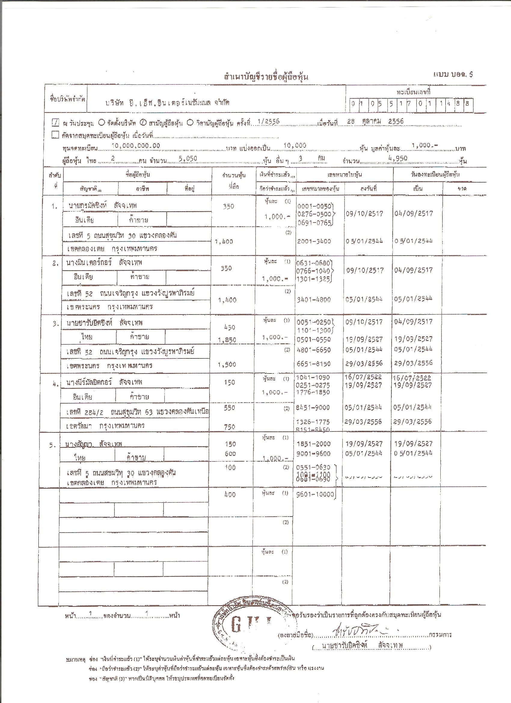 สำเนาบัญชีรายชื่อผู้ถือหุ้น บริษัท ยี.เอ็ช.อินเตอร์เนชั่นแนล จำกัด ณ วันที่ 28 ตุลาคม 2556 มีจำนวนผู้ถือหุ้น 5 ราย