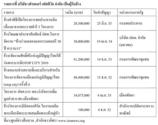 ตั้งแต่เดือนธันวาคม 2552 – มิ.ย.2555 บริษัท เฟรชแอร์เฟสติวัล จำกัด ได้รับว่าจ้างจากหน่วยงานรัฐ 5 แห่ง 6 โครงการเป็นเงิน 262,875,000 บาท (ดูตาราง)