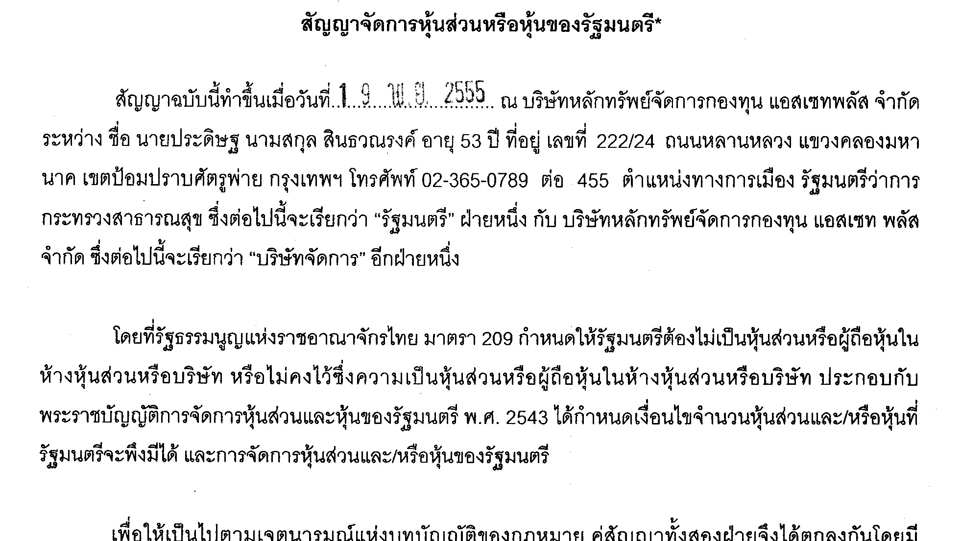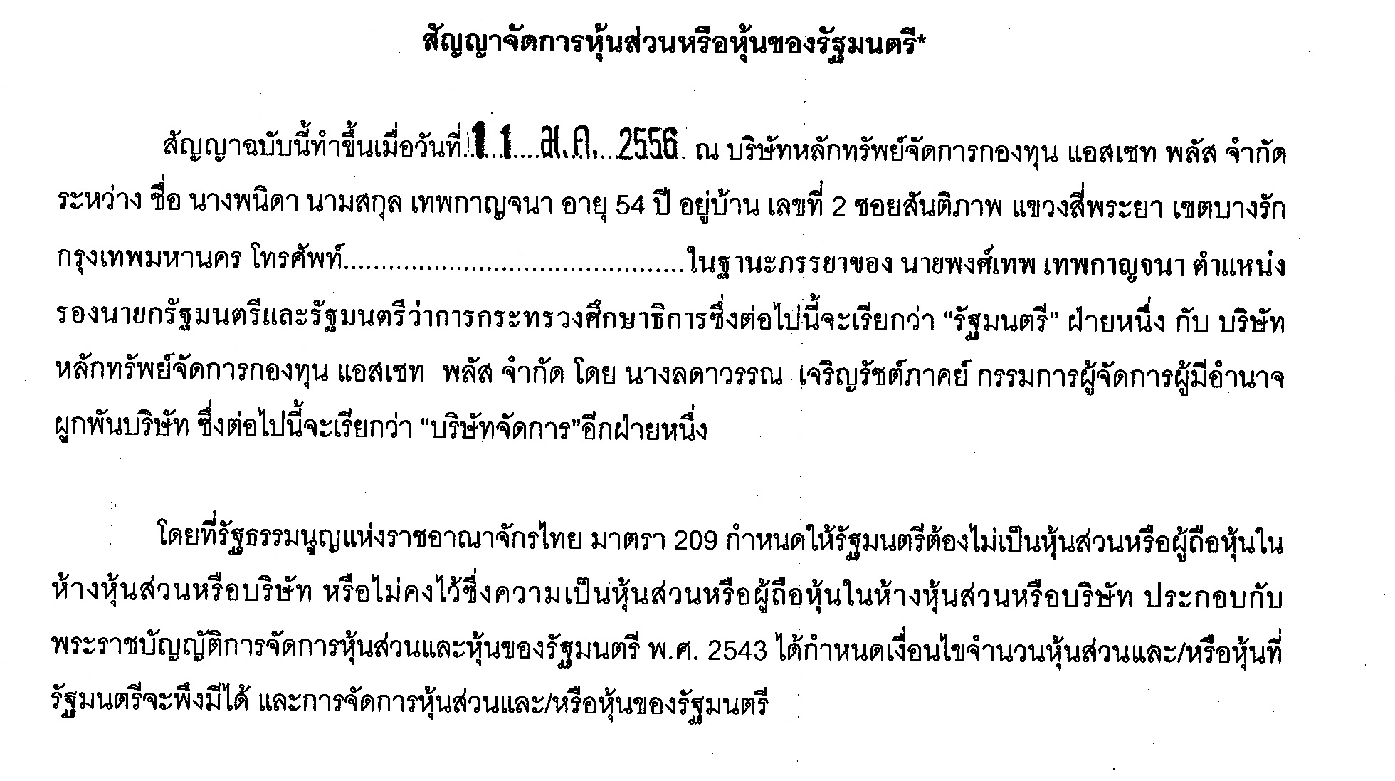 ทั้งนี้ การว่าจ้างนิติบุคคลบริหารจัดการเงินลงทุนทรัพย์สิน(หุ้น) ของรัฐมนตรีเป็นไปตามบทบัญญัติของรัฐธรรมนูญแห่งราชอาณาจักรไทย พ.ศ.2550 มาตรา 269 กำหนดให้รัฐมนตรีต้องไม่เป็นหุ้นส่วนหรือผู้ถือหุ้นในห้างหุ้นส่วนบริษัท หรือไม่คงไว้ซึ่งความเป็นหุ้นส่วนหรือผู้ถือหุ้นในห้างหุ้นส่วนหรือบริษัท ประกอบพระราชบัญญัติการจัดการหุ้นส่วนและหุ้นของรัฐมนตรี พ.ศ.2543 ได้กำหนดเงื่อนไขจำนวนหุ้นส่วนที่รัฐมนตรีถือครองได้ไม่เกิน 5% หากรัฐมนตรีและคู่สมรสมีความประสงค์จะได้รับประโยชน์จากการถือครองหุ้นในส่วนที่เกิน 5% จะต้องโอนหุ้นให้นิติบุคคลภายใน90 วัน และแจ้งให้ ประธาน ป.ป.ช. ทราบ (มาตร5)