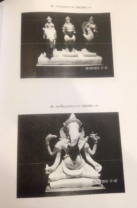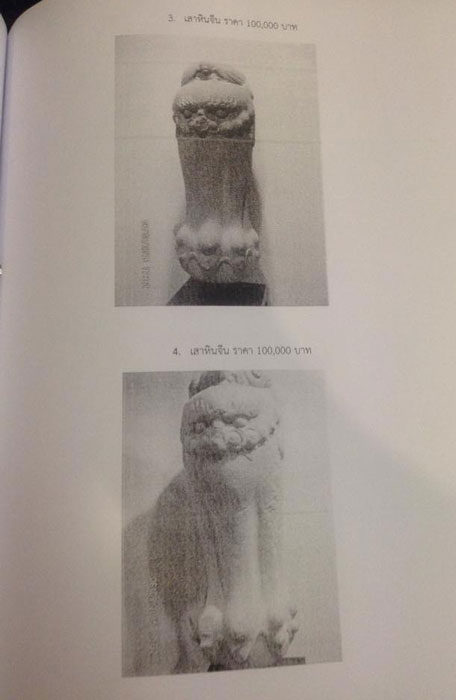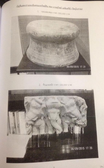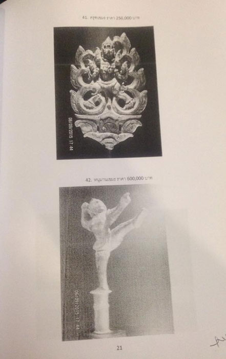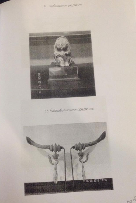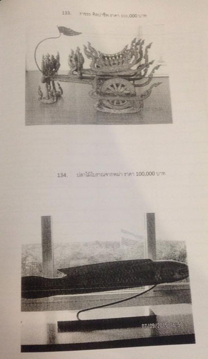 เช่น กลองลองซอง 5 แสนบาท หินแกะสลัก 1 แสนบาท เสาหินจีน 1 แสนบาท กระเบื้องเขมร 2 แสนบาท ชิ้นส่วนเสลี่ยงโบราณ 2 แสนบาท ครุฑเขมร 2.5 แสนบาท หนุมานเขมร 5 แสนบาท เทวรูปเขมร 3 แสนบาท พระพิฆเนศเขมร 1 แสนบาท ราชรถศิลปาชีพ 3 แสนบาท ปลาไม้โบราณจากพม่า 1 แสนบาท เป็นต้น (ดูภาพประกอบ)