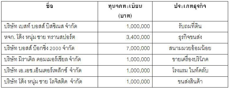 1.หจก. โต้ง หนุ่ม ชาย ทรานสปอร์ต ธุรกิจขนส่ง จดทะเบียนวันที่ 22 มกราคม 2539 ทุน 3.5 ล้านบาท ที่ตั้งเลขที่ 950 ถนนเอกชัย แขวงบางบอน เขตบางบอน กรุงเทพฯ มีหุ้นส่วน 3 คนคือ นายอาจหาญ อยู่บำรุง บุตรชายคนโต นายดวง อยู่บำรุง และ นางสาวอุบล แก้วสามสี ผลประกอบการปี 2552 รายได้ 14,524,448 บาท กำไรสุทธิ 897,775 บาท ปี 2553 รายได้ 20,598,034.43 บาท กำไรสุทธิ 1,069,640.99 บาท สินทรัพย์ 8,608,201.25 บาท