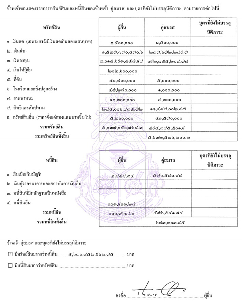 รวมทรัพย์สินทั้งคู่ 5,632,536,266 บาท มีหนี้สินทั้งสิ้น 683,303 บาท