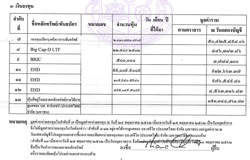 ขณะเดียวกันแจ้งเงินลงทุน หุ้นในตลาดหลักทรัพย์ที่อยู่ภายใต้การดูแลของบริษัท อาร์เอชบี (ประเทศไทย) จำกัด (มหาชน) จำนวน 153,344,761 บาท กองทุนรวมและหุ้นกู้ภายใต้การดูแลของบริษัท ภัทร จำกัด (มหาชน) จำนวน 24,414,748 บาท มีหน่วยลงทุนที่อยู่ภายใต้การดูแลของ บล.โนมูระ พัฒนสิน จำกัด (มหาชน) 3,045 บาท กองทุนรวมในบัญชี Sumitomo Mitsui Bangking Corporation 1,574,229 บาท หุ้นที่อยู่ในตลาดหลักทรัพย์ภายใต้การดูแลของบริษัท เมย์แบงก์ กิมเอ็ง (ประเทศไทย) จำกัด 1,586,567 บาท บัญชีแคลบาลานซ์ บล.เมย์แบงก์ กิมเอ็ง (ประเทศไทย) จำกัด 115,298 บาท และหุ้นที่อยู่ในตลาดหลักทรัพย์ภายใต้การดูแลของ บล.โนมูระ พัฒนสิน จำกัด (มหาชน) 21,229,948 บาท รวมมูลค่า 202,268,596 บาท